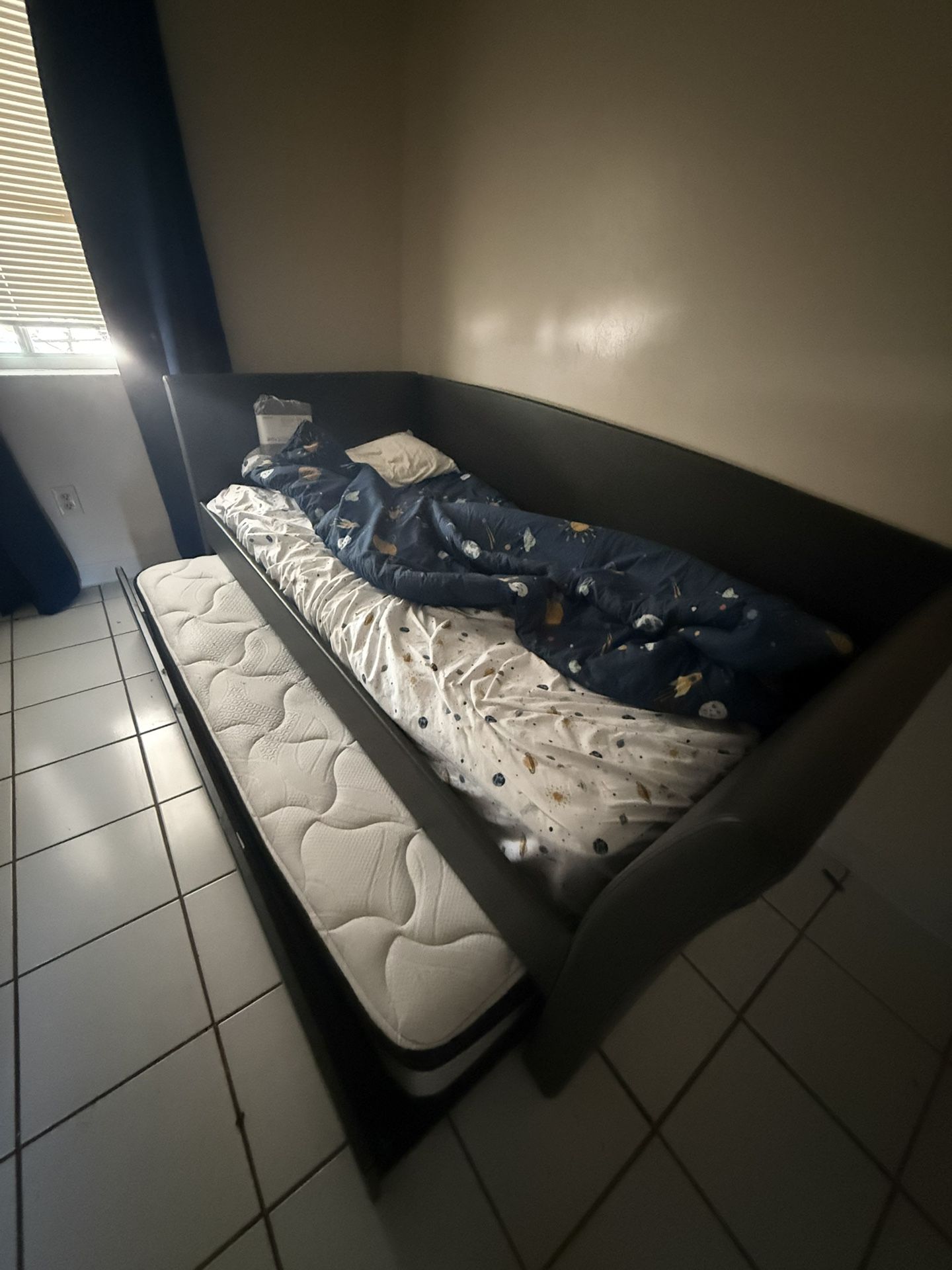 Moving need it gone! Double bed, comes with top twin matress and twin bedding.