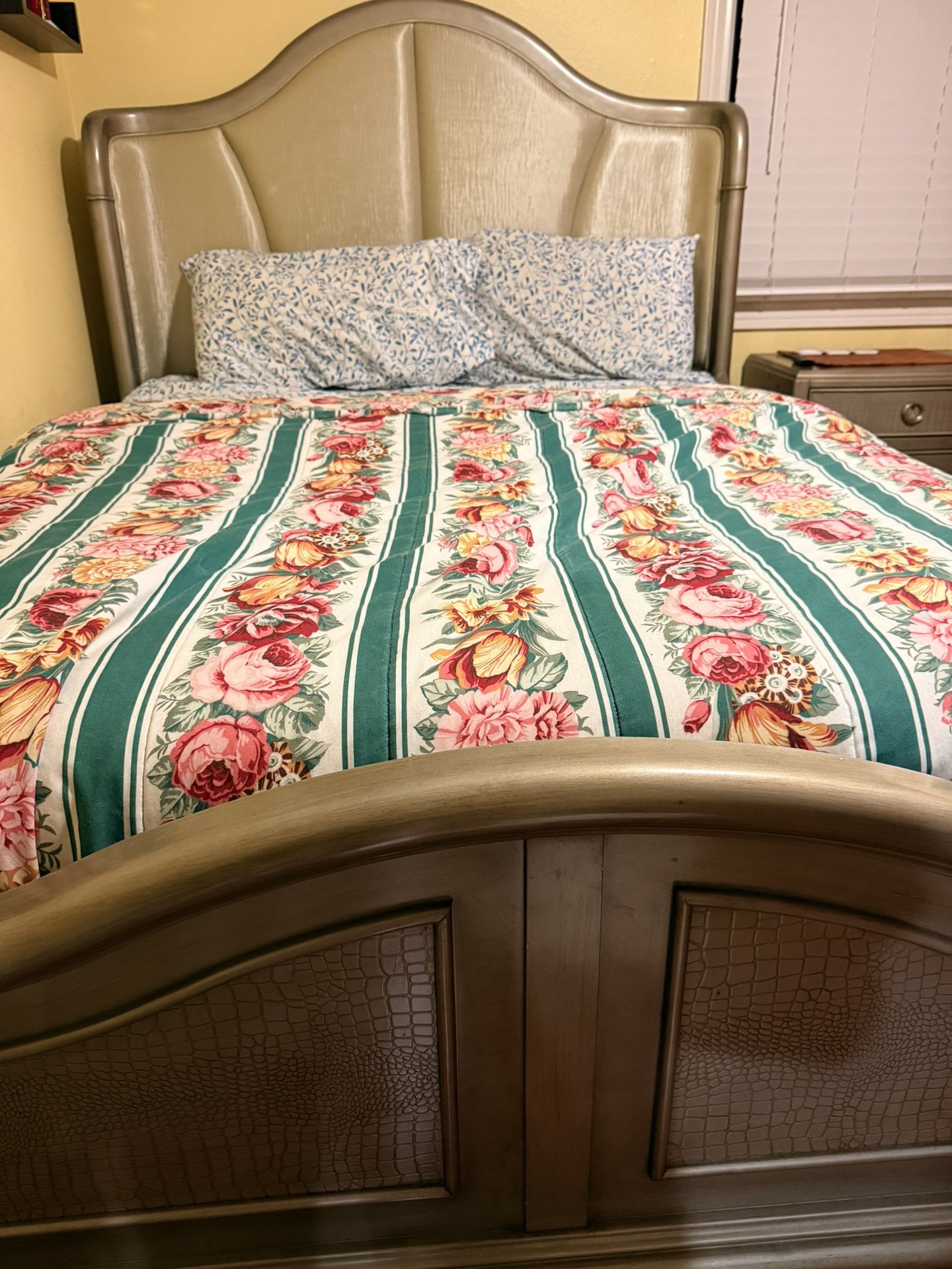 Beautiful Queen-size Nisha bed with 2 matching nightstands. Features a sleek, modern design with a tufted padded headboard and a stylish low-profile footboard. Solid wood and wood veneer construction with a gold finish and silver upholstery accents. Sturdy and comfortable, perfect for a modern or transitional bedroom. Details: • Queen size bed frame • Includes 2 nightstands • Solid wood / wood veneer construction • Tufted padded headboard • Gold frame finish with silver upholstery • Dimensions: 88” L x 68” W x 66” H