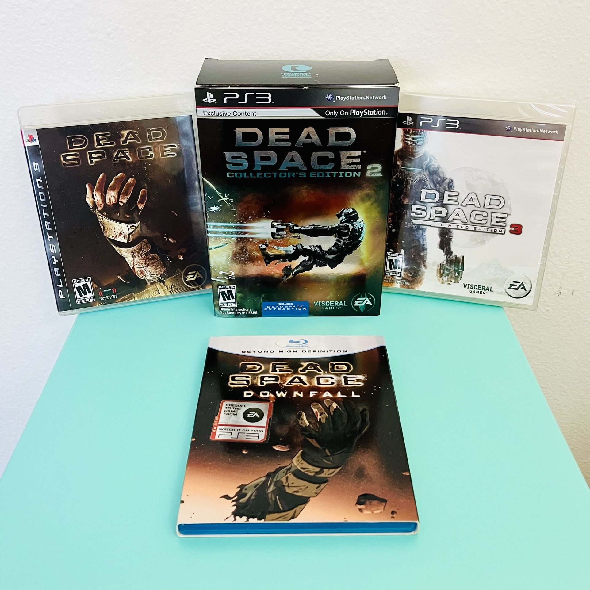 1. Dead Space (PS3, 2008) • Original Black Label • Game tested 2. Dead Space 2 Collector’s Edition (PS3, 2011) • Complete-in-box! All original contents! • Like-new condition! • Soundtrack still sealed! 3. Dead Space 3 Limited Edition (PS3, 2013) • Brand new. Factory sealed! 4. Dead Space: Downfall (Blu-ray, 2008) • Prequel animated movie to the first game! • Includes rare Slipcover case! ————————————————————————- *I only meet locally and accept cash. Zelle and Cash App also accepted! *Shipping available thru above methods of payment. Please allow 3-5 business days to ship. Tracking will be provided. All pictures are my own and of the actual product. May contain stock images for purpose of showing contents of unopened items. Thank you for visiting my page! 🥰 Please take a moment to browse my other listings. I entertain discounts for multiple purchases. If you like my items, please consider giving me a follow! I’m still listing more items from my collection each week. 😊 ⭐️ As a long time trusted seller since 2016, I strive for excellence and buyer satisfaction. Please feel free to ask me any questions.