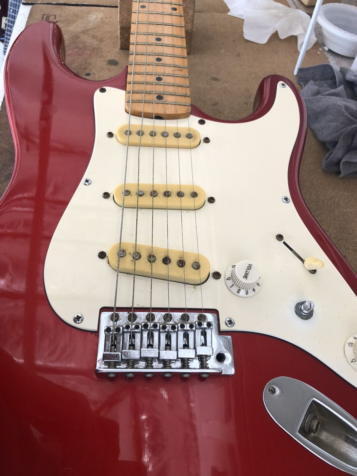 Very cool sounding vintage pickups. Cleaned, adjusted, polished and new strings, beautiful RED color. Neck plate has model tag that looks like TL600MR Red Electra electric guitar, fish mouth head stock, gold painted logo with rounded "E", strat style with three single coil pickups, 3-way switch, volume and 2 tone controls. Pickups read 7.40, neck, 7.70 middle, 7.90 bridge. Gloss neck. Laminate (But heavy body.) 8 screw pick guard. In the Fender Stratocaster style of the 50's & 60's Neck straight, frets OK. Plays well, sounds fantastic. Truss adjustment at base of neck