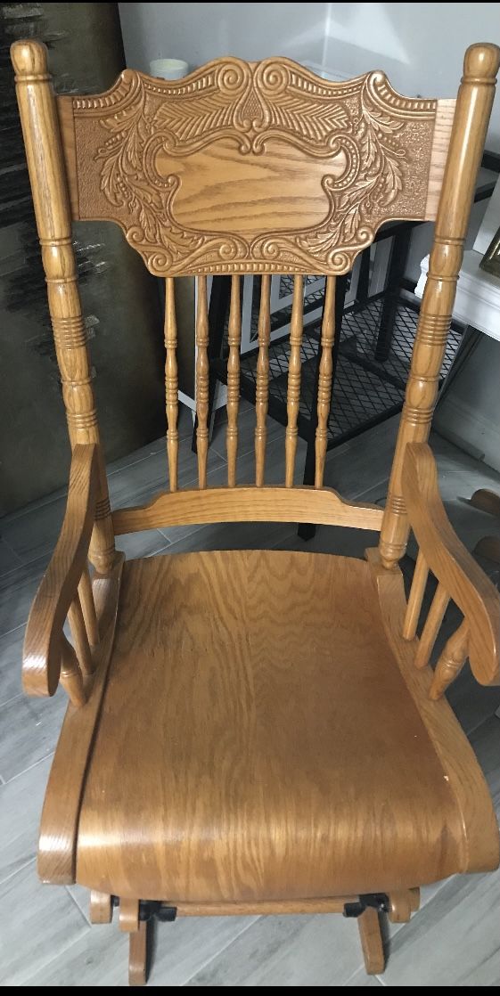 Beautiful oak rocking chair. Great condition. I rocked my babies but now time to let it go.
