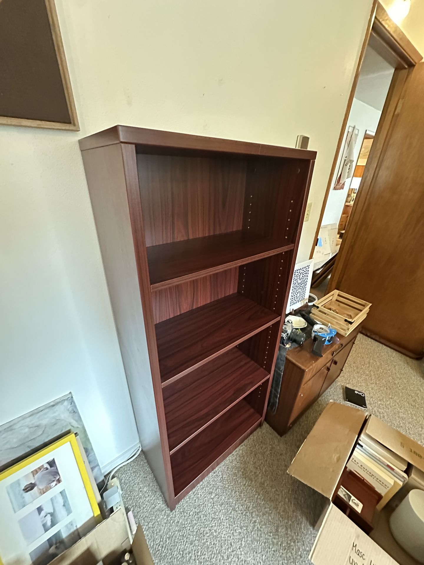 Great mahogany finish 4-shelf bookcase in good condition, only getting rid of it due to a move! Has been a solid home office staple and looks great in any room. Minor scratch on the top edge, everything else is in great shape. Shelves are fully adjustable and feet are leveling so it sits flush on any surface. Comes with wall-securing hardware already installed, great for households with kids or pets. Currently unavailable on Amazon, originally sold for around $170 new. Dimensions: 24.4”W x 11.6”D x 55.9”H Price negotiable, buyer pick up in North Greenwood area.