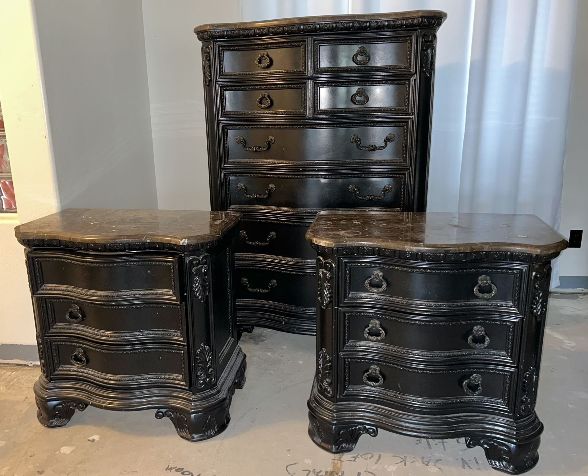 Read Description!!! 3 piece dresser set. Tall dresser 62in H 44in wide 23in deep 2 Night stands 32in H 32in wide 20in deep Marble is scratched and some breaks. One night stand is missing pulls. This is an old bedroom set, but will be a furniture restorer’s next treasure. Very heavy need a truck and 2-3 helpers.