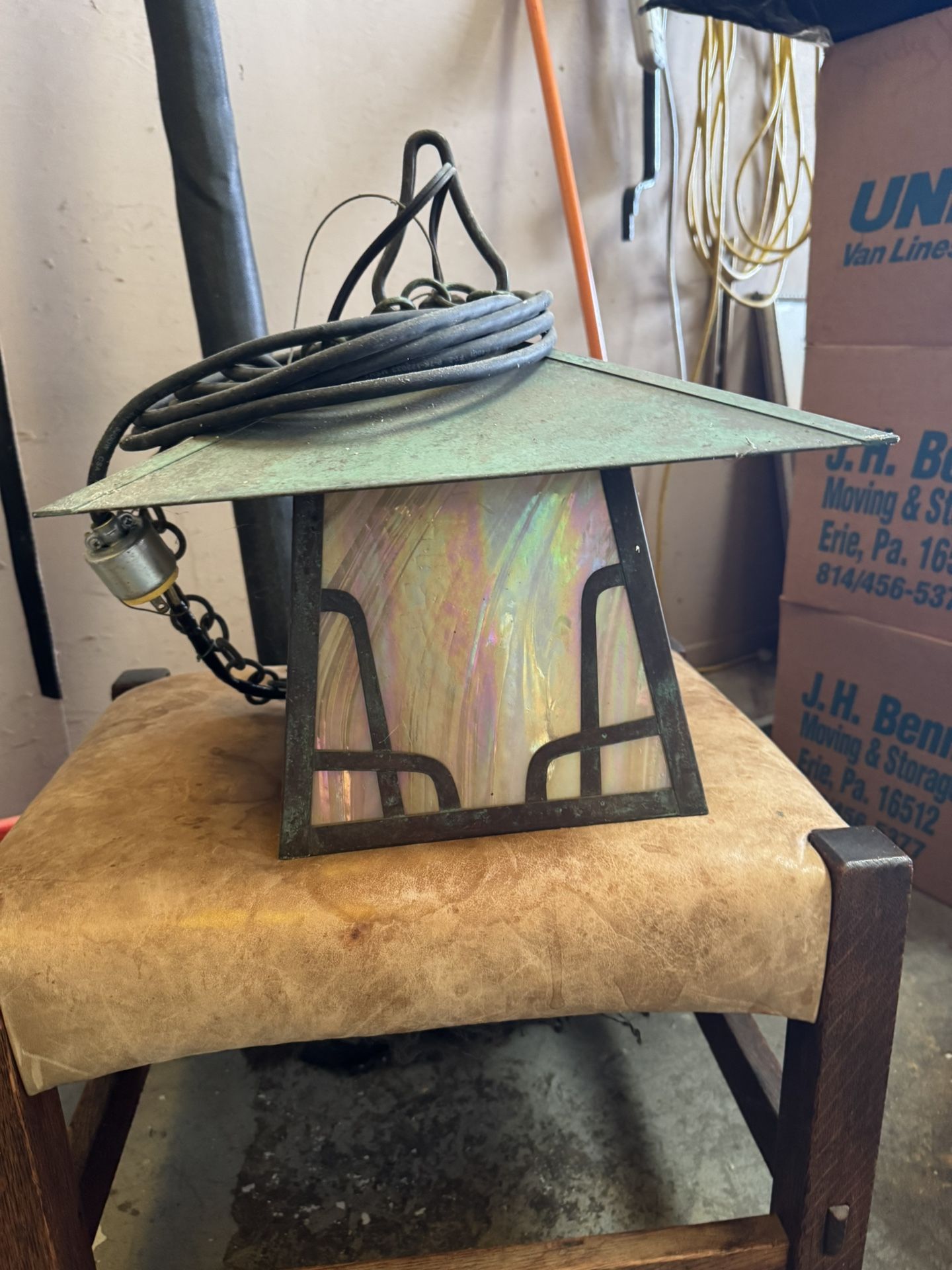 Arts and crafts cloud relief exterior hanging chandelier. Approximately 16 inches square, and approximately 12 inches tall.
