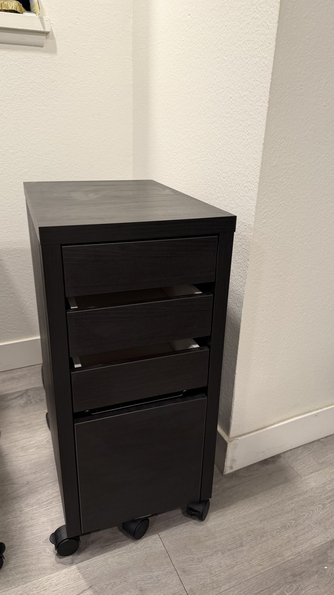 Compact black rolling file cabinet in great condition. Perfect for home office or small spaces. Features: • 4 drawers (3 small + 1 large bottom drawer) • Bottom drawer fits hanging files • Smooth sliding drawers • Wheels for easy movement • Modern dark wood finish Very clean inside and out. Works perfectly. 📍 Pick up only - Huntington Beach Area Size - 14” wide x 20” deep