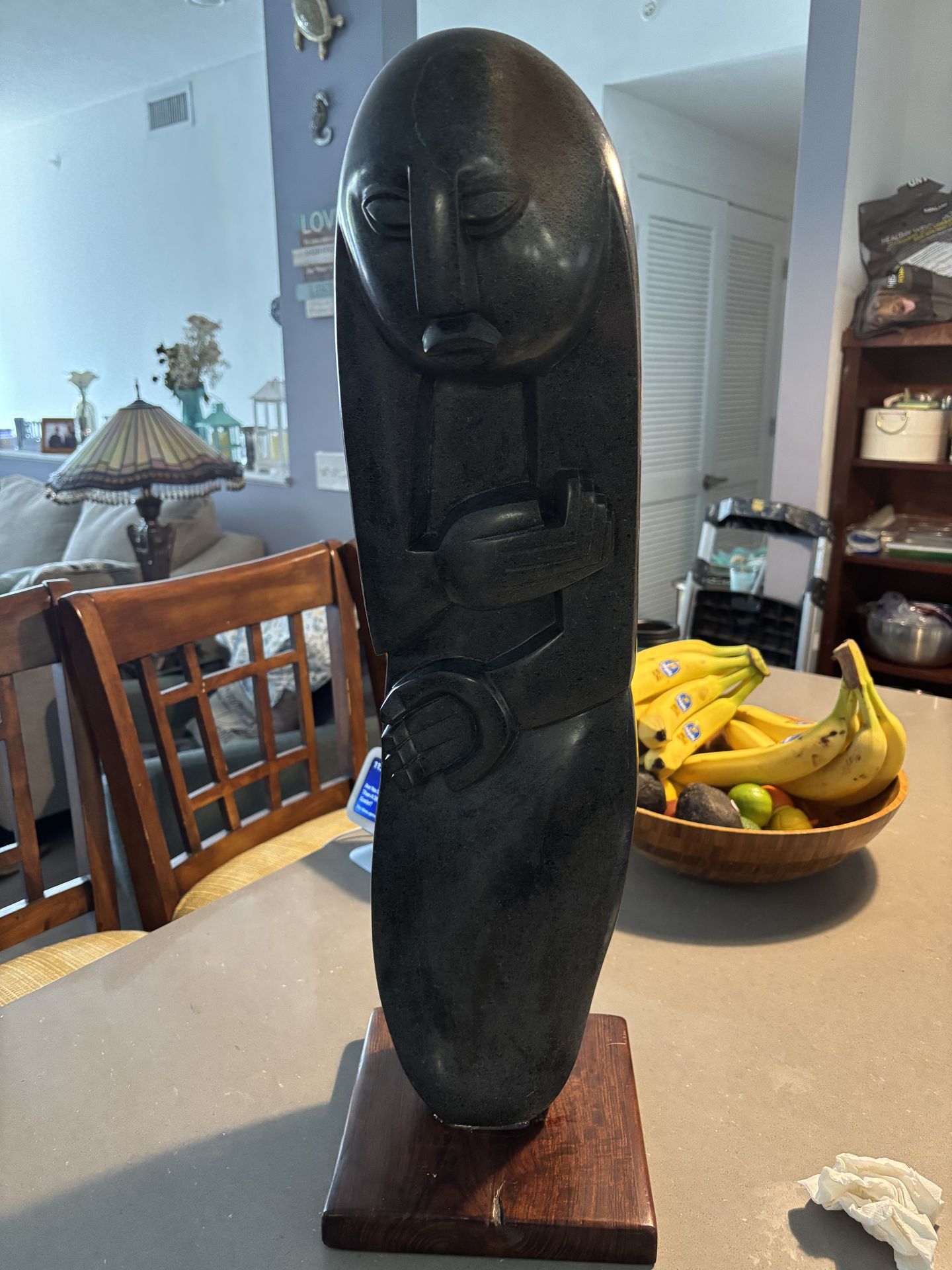 This item is a vintage African Shona sculpture handcrafted from serpentine stone in Zimbabwe. Art Style: Shona sculpture is renowned for its figurative abstract style, often depicting human forms or spirits. Material: It is carved from serpentine, a durable stone known for its mottled grey or green tones and high polish potential. **** Will take best offer.