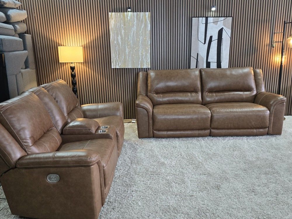 LIKE NEW Ashley Trasimeno 2 Power Reclining Loveseats with Console in Caramel Real Leather