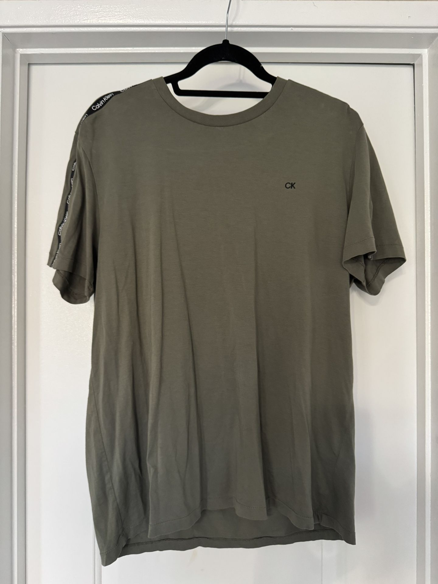 Menβs Calvin Klein short-sleeve tee featuring embroidered CK logo on the front and Calvin Klein logo tape along the shoulder. Soft 100% cotton in olive green β comfortable and clean-cut design. Great condition, no stains or flaws. π Size: Large π¨ Color: Olive Green π Pickup in Chula Vista / South San Diego