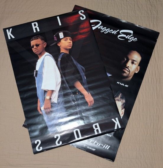 Vintage Hip Hop And R&B Poster Bundle Of Two. Bundle includes the two posters pictured; 1992 Kris Kross Inc poster. Measurements are approximately 35" long X 23&1/4" wide. 2001 Jagged Edge, Jagged Little Thrill. Measurements are approximately 36&1/4" long X 24&1/4" wide. These posters are in fair condition. Please note the damage, and creases as highlighted in the photos. Must pick up. Cash only please. Let me know if you have any questions, or offers. No pets and non smoking home.