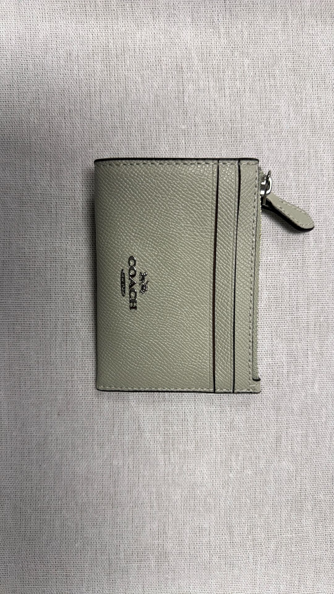 Coach Mini Skinny ID Case in crossgrain leather and a light pale pistachio/sage green color.