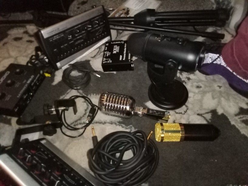 Music equipment all intact with cords and mounts. PYLE PRO VINTAGE MIC BLUE CONDENSED MIC SHURE GOLD MIC M-AUDIO M-TRACK SOLO MIXER ROLLS PM55P PERSONAL MONITER AMP+ BEHRINGER POWER PLAY 16 CHANNEL DIGITAL PERSONAL MIXER P16-M WITH MOUNTS