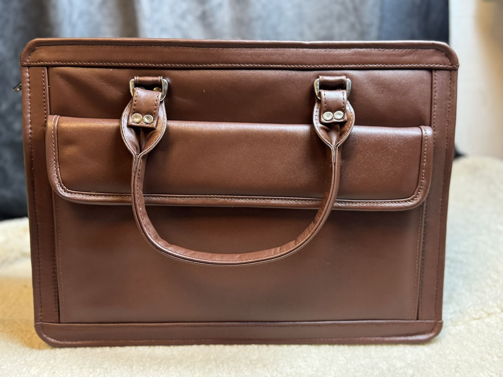 This brown briefcase is crafted from genuine leather with a smooth, structured finish that delivers a classic and professional look. It features sturdy dual top handles with a padded grip and includes a detachable adjustable shoulder strap for versatile carry options. The bag secures with dual top zip compartments, opening to a fully lined interior designed to keep documents, accessories, and daily essentials well organized. The interior includes multiple sections and zippered pockets, making it ideal for business, office use, travel, or everyday professional wear. Finished with reinforced stitching, durable hardware, and clean panel construction, this bag combines functionality with timeless style. Features: • Genuine leather exterior • Color: Brown • Dual top zip compartments • Dual top handles with padded grip • Detachable adjustable shoulder strap • Fully lined interior with organizer pockets • Structured briefcase / messenger design Please review all photos carefully, as they show the exact item you will receive.