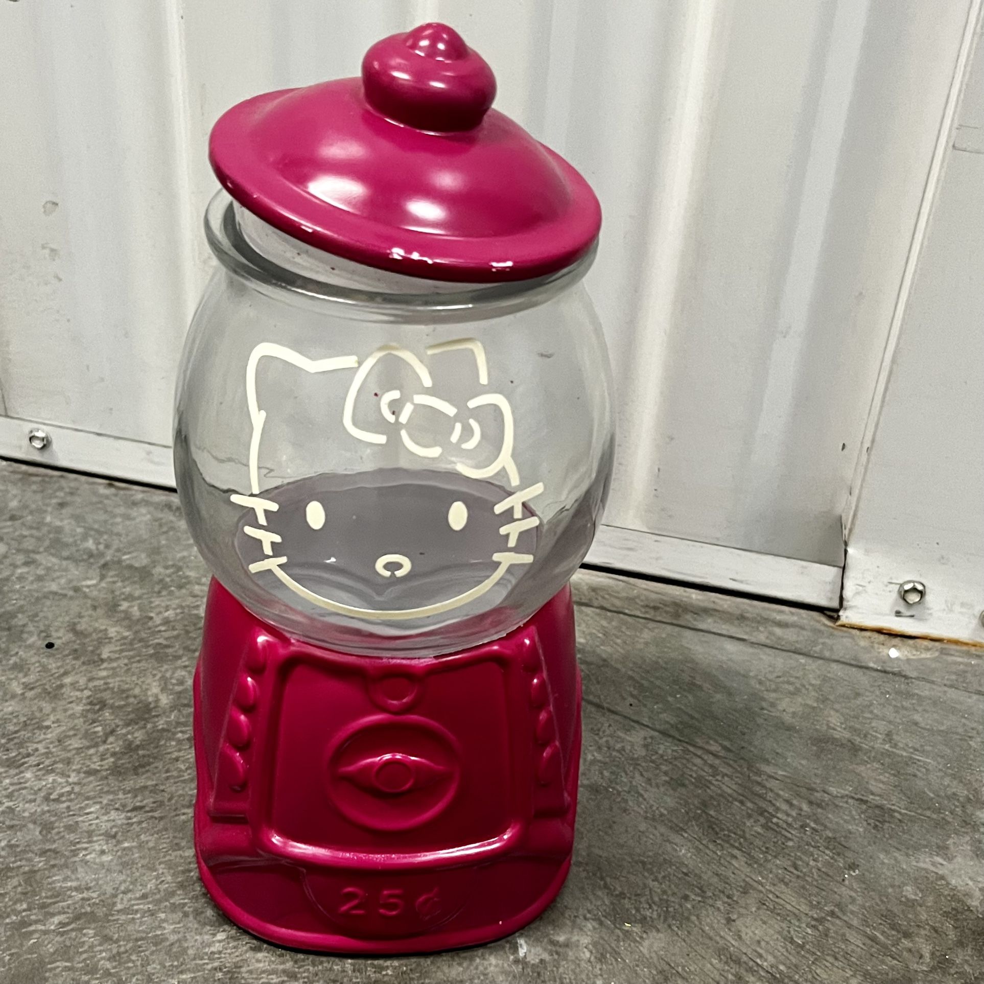 Magenta painted glass gumball machine with removable lid. This was from Target Bullseye Section last year. I spray painted it pink and then printed out the Hello Kitty decal on my Cricut machine. 12” tall Would be fun decor in a girls bedroom or for any Hello Kitty lovers. (Please note that there are some imperfections to the paint job.)