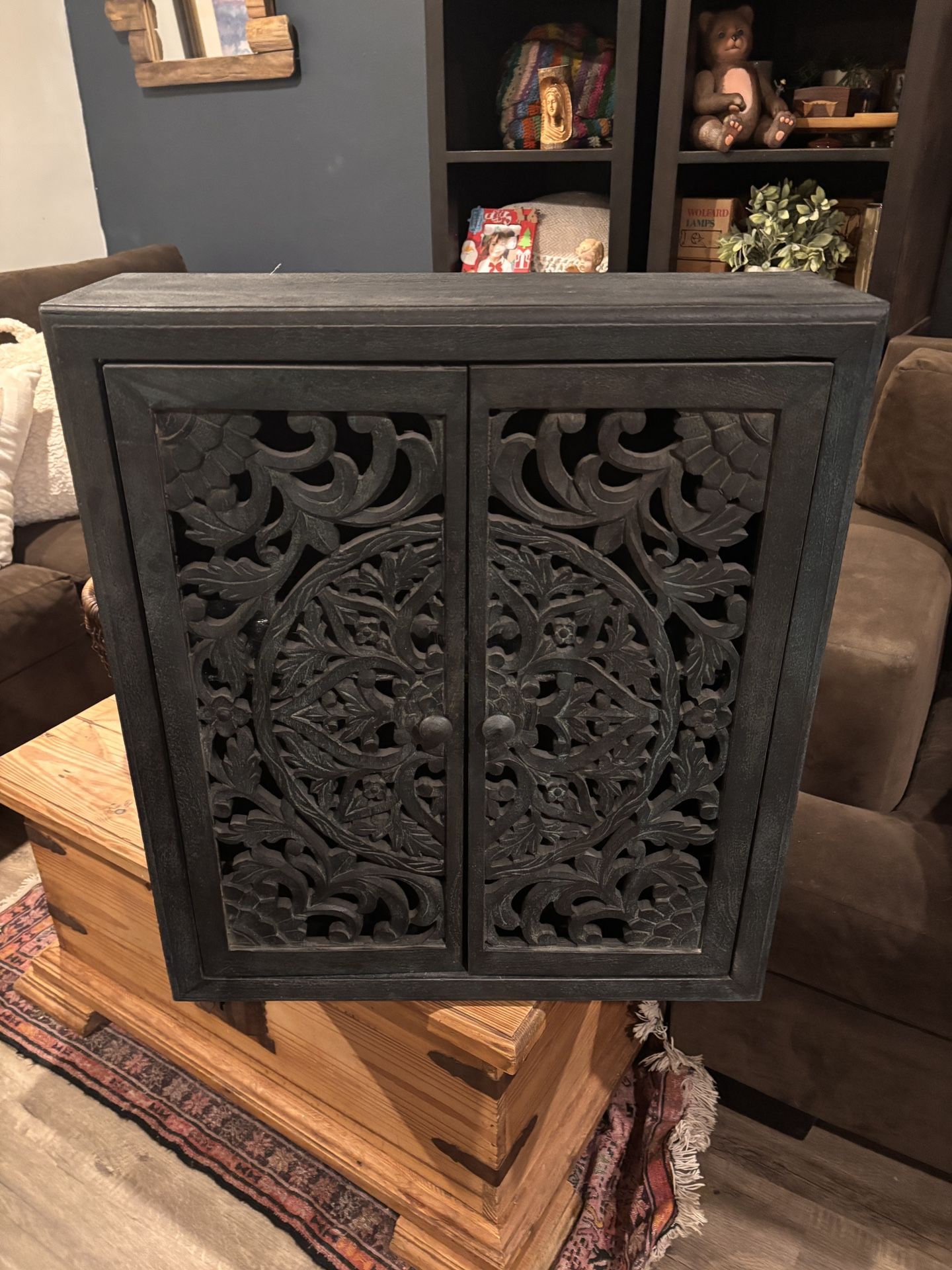 Beautiful designed cabinet with glass shelf inside. Greenish/blueish color. $40 2.3”tall x 2’ wide x 8” deep. Woodland Hills pickup