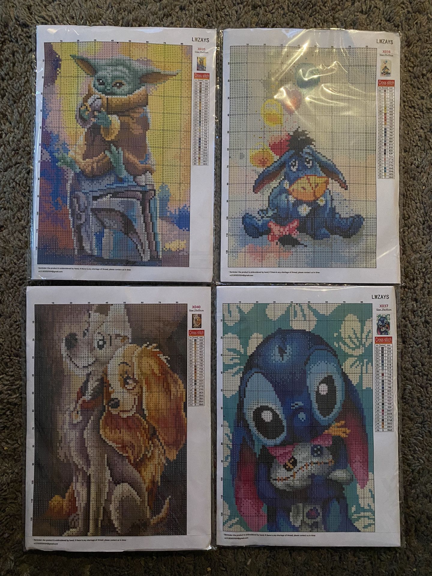 4 Disney Crosstitch kits, stitch, Lady and the tramp, Eeyore, baby Yoda. Size 25x35 cm each Asking $5 for each Pick up only ** Stitch is SOLD **