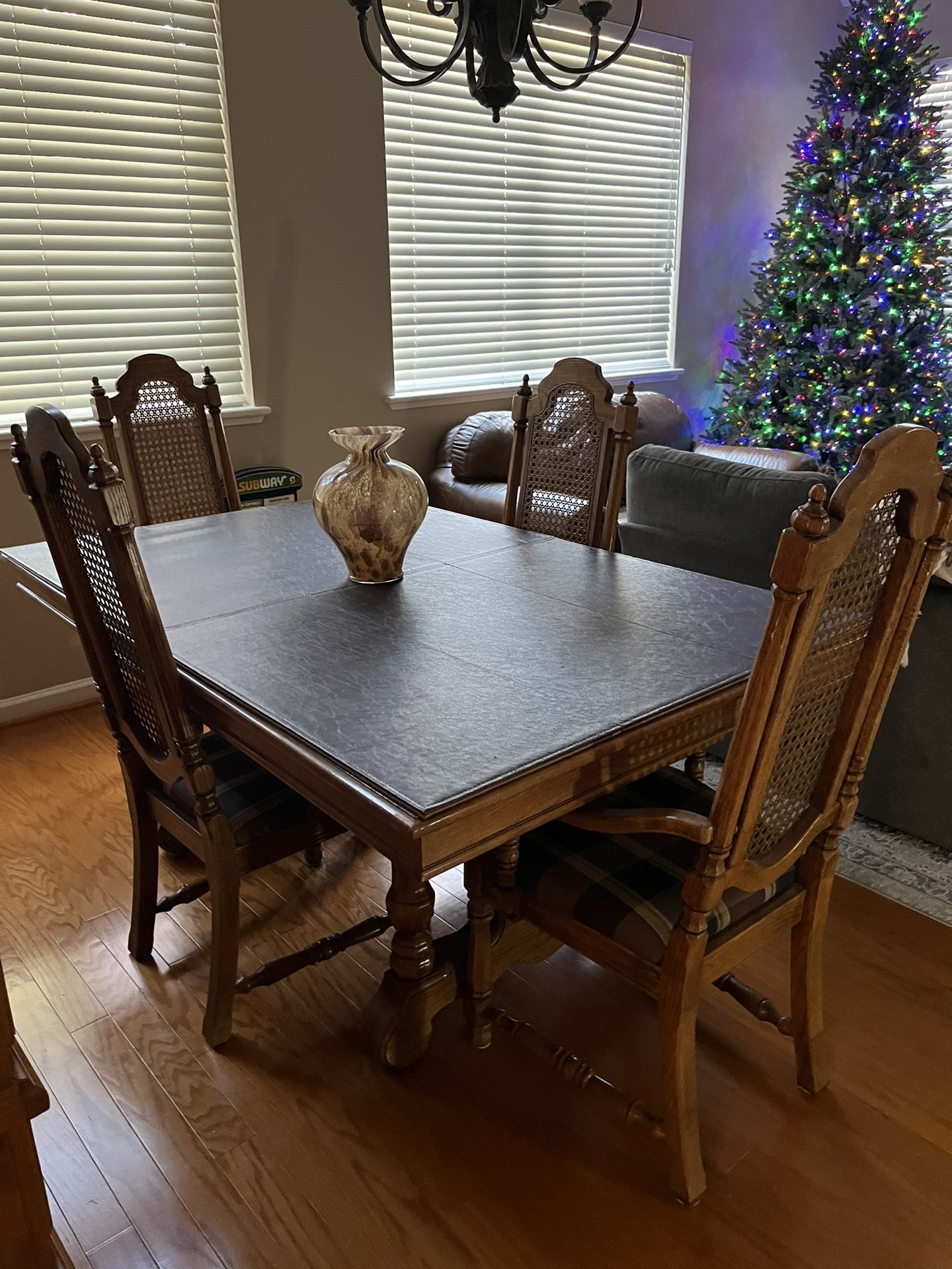 Beautiful solid wood dining room table with 6 chairs and 2 leaves. Gets quite large when using both. Top has always had a top protection on and is in great condition. 300 OBO