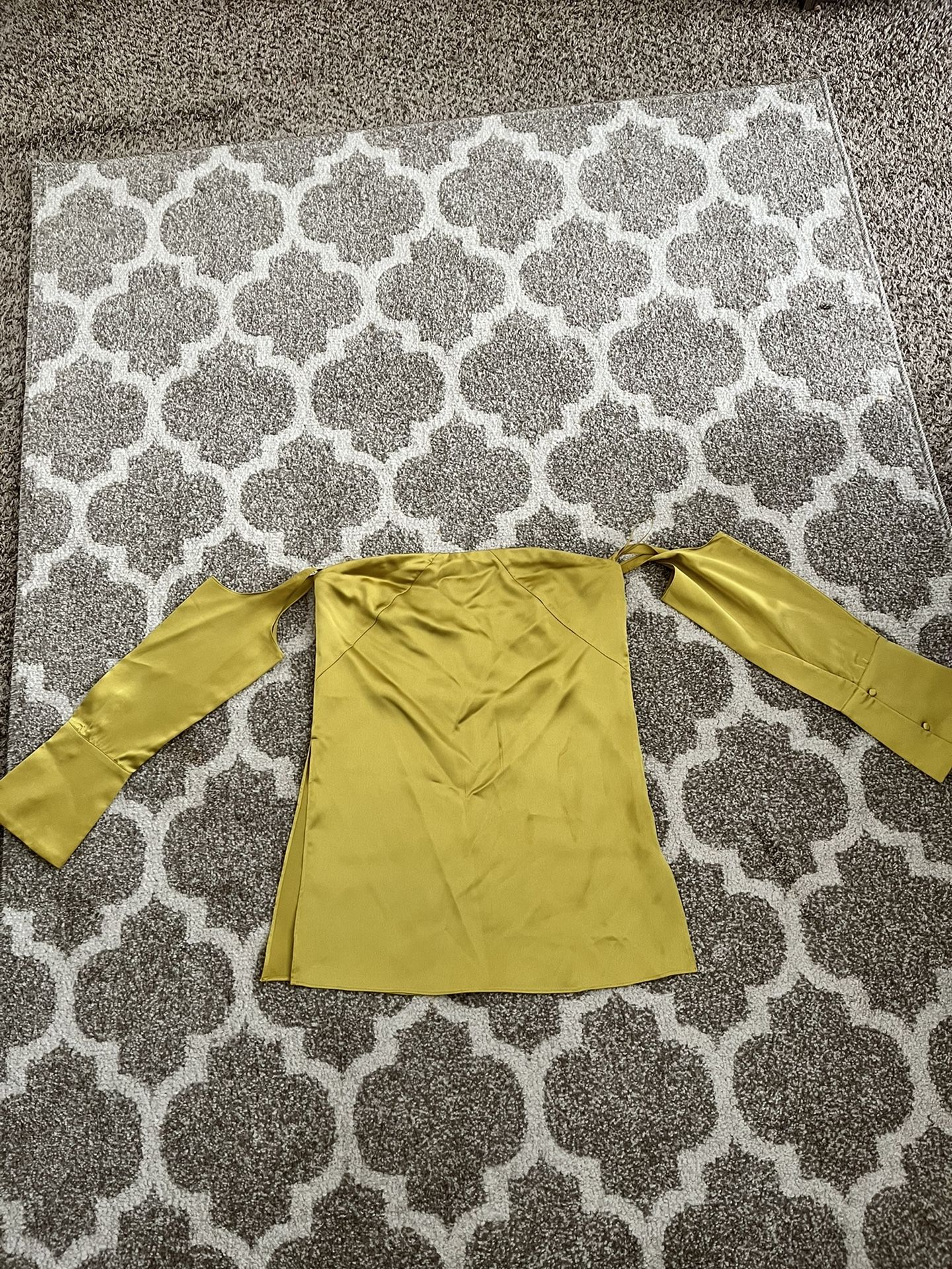 Greenish yellow strapless top with sleeves. Slit up the sides. Never worn but was dry cleaned to remove creases and folds