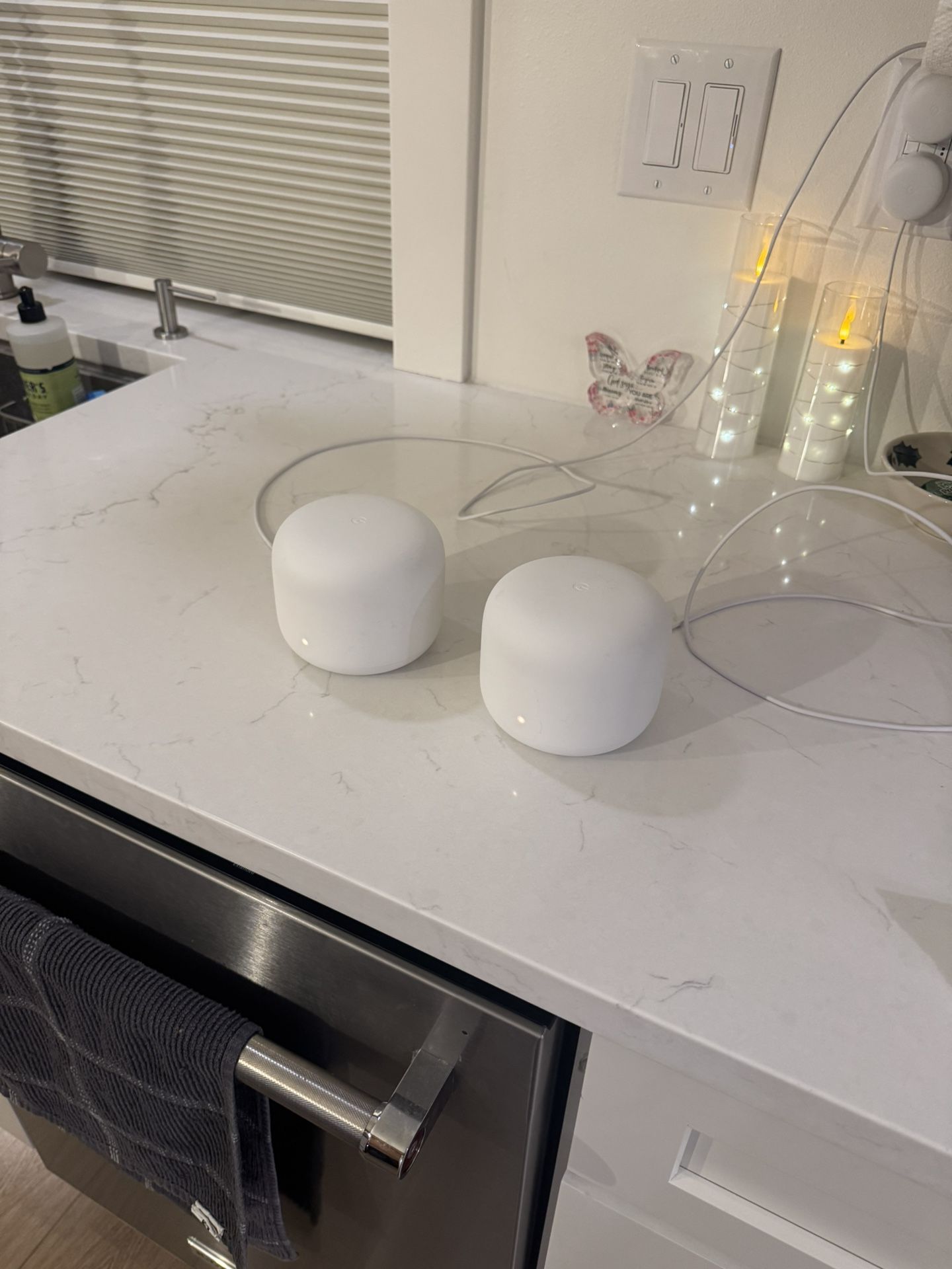 Google Nest Wifi routers (model H2D). Fully factory reset and working perfectly. Can be used together as a mesh system or individually. Includes 2 power cords + 1 ethernet cable. Great for whole-home WiFi coverage.