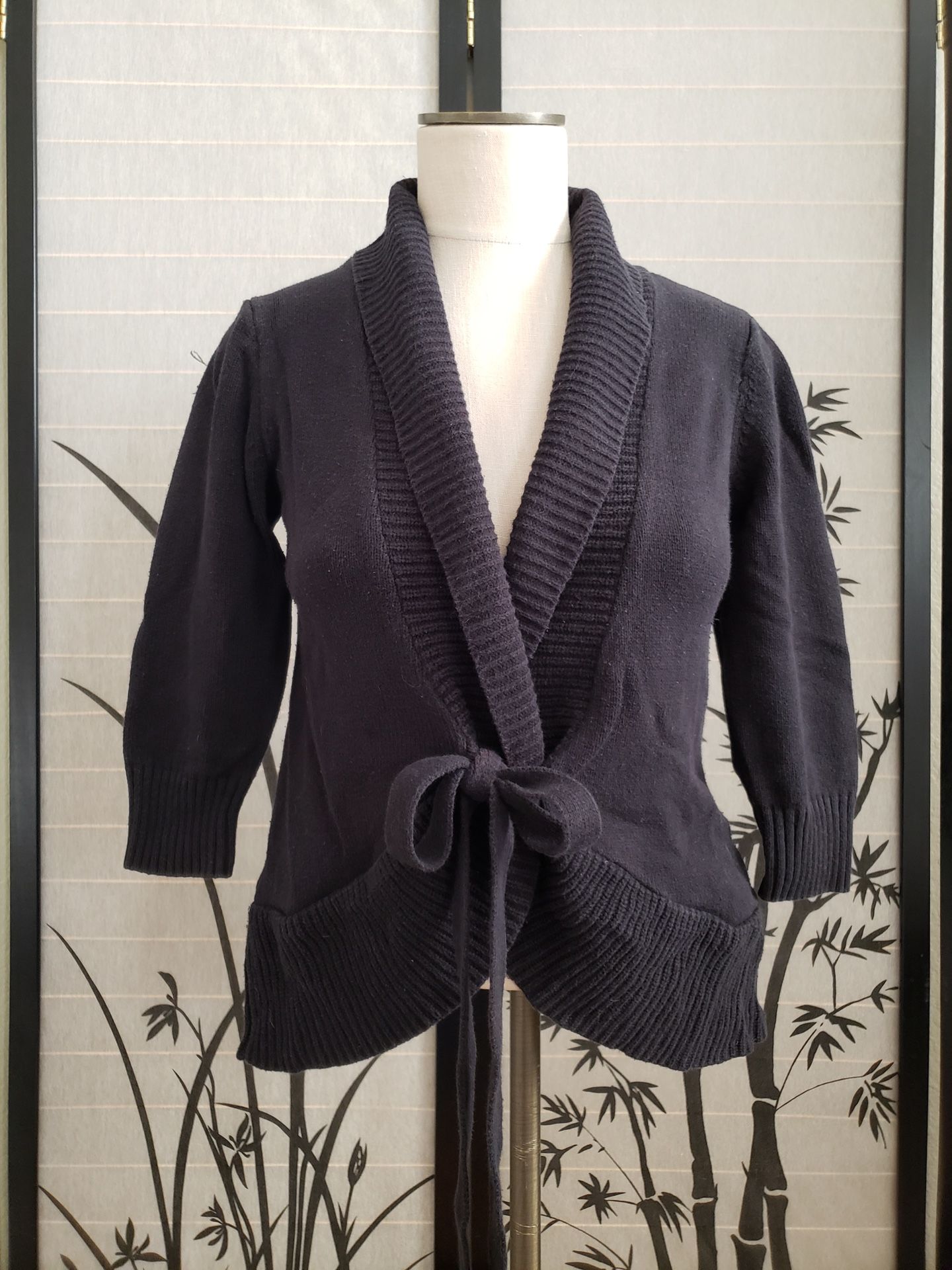 Designer: IZ Byer Size: Large Color: Black Armpit to armpit: 18 1/2 inches Length: 22 inches Open front cardigan sweater 3/4 sleeves Ribbed hem fold over collar Ties at low front center Ribbed hem cuffs EUC with no notable rips, stains, tears, flaws, etc