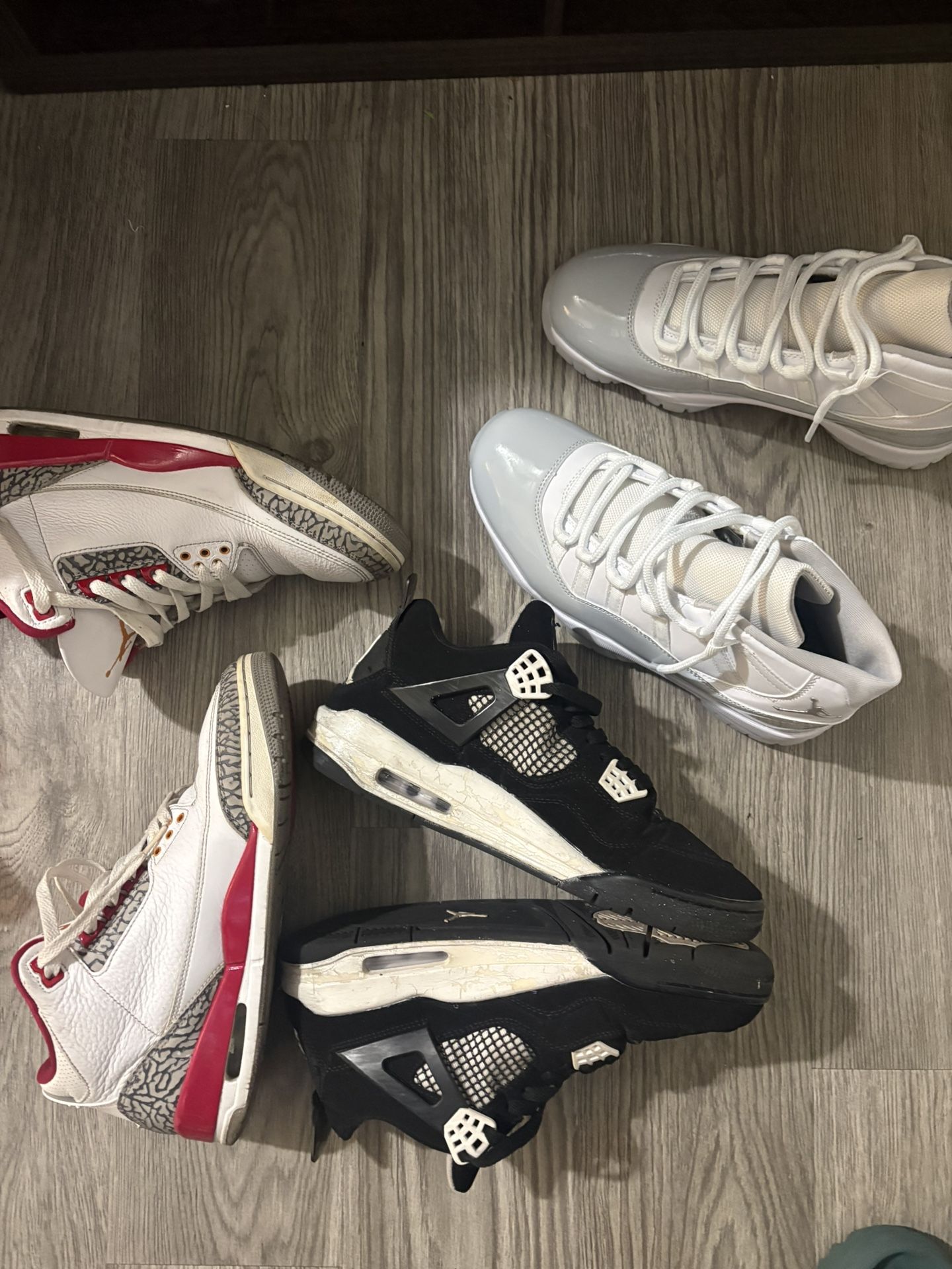 All size 9.5 Jordan 11 are brand new lmk The others are just there rlly beat up the 4s are a little ripped from the back but if you ca revive them they’ll look new lol lmk