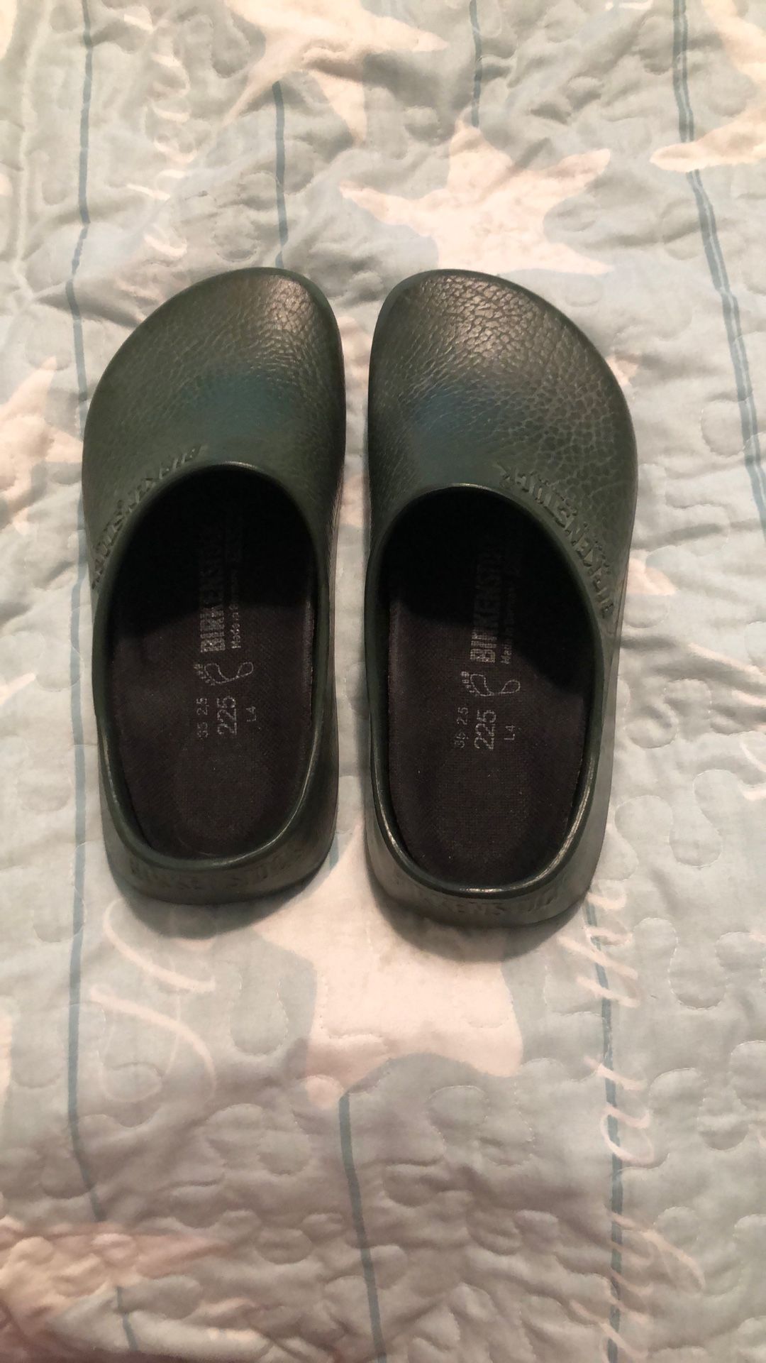 Used Birkenstock clogs, size 35R (6-6 1/2 C US) with brand new Birkenstock insoles I just bought - - insoles not worn. From smoke-free environments. Dark Blue. I paid $35 for the NEW insoles / footbeds; that is my price for these.