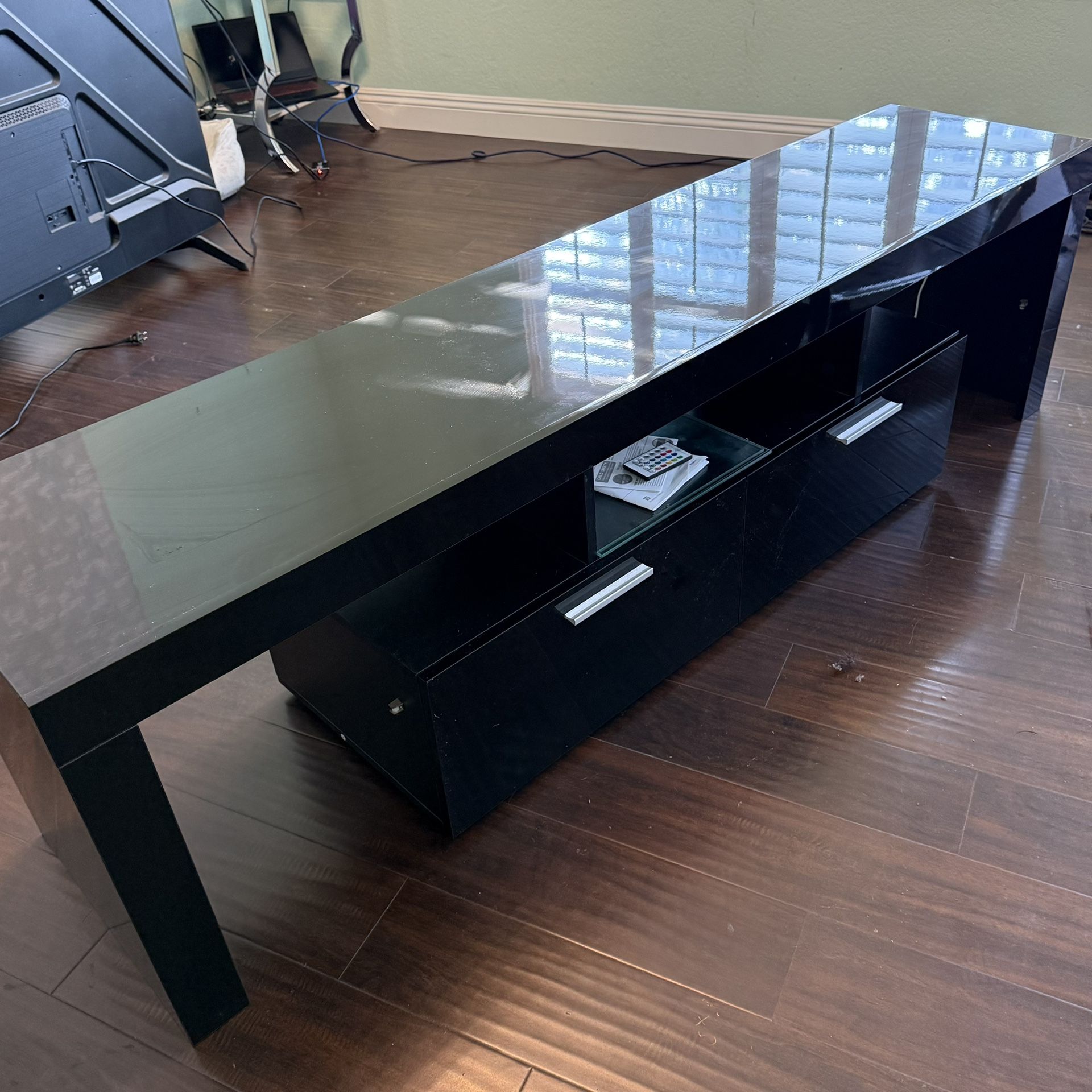 Black tv stand Led lights on back Fits 72” tv Two drawers for storage on bottom