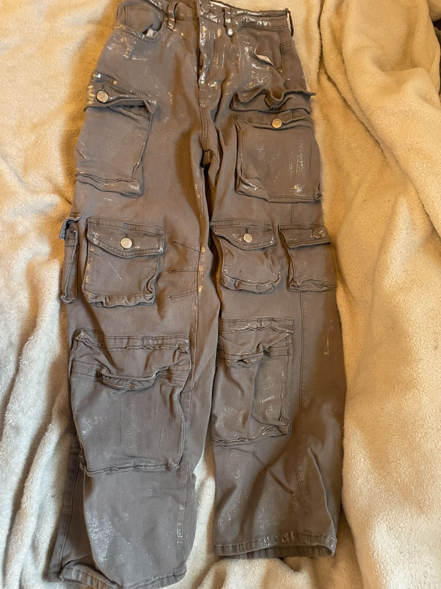 Baggy grey jeans with lots of pockets and slightly glittery in some spots