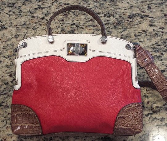 Dana Buchman Tara Colorblock purse with top handle, faux croc leather, over the shoulder strap, Red/White/Brown. 1 hand strap, 13" drop shoulder strap. Front compartment has twist lock entry, 1 open pocket on front panel, back panel has 1 zippered pocket. Back compartment has magnetic snap closure with no extra pockets. Silvertone Hardware. Super cute! 11"Hx12"Wx3"D Only used a few times. No rips, tears or stains. Comes from smoke-free home.