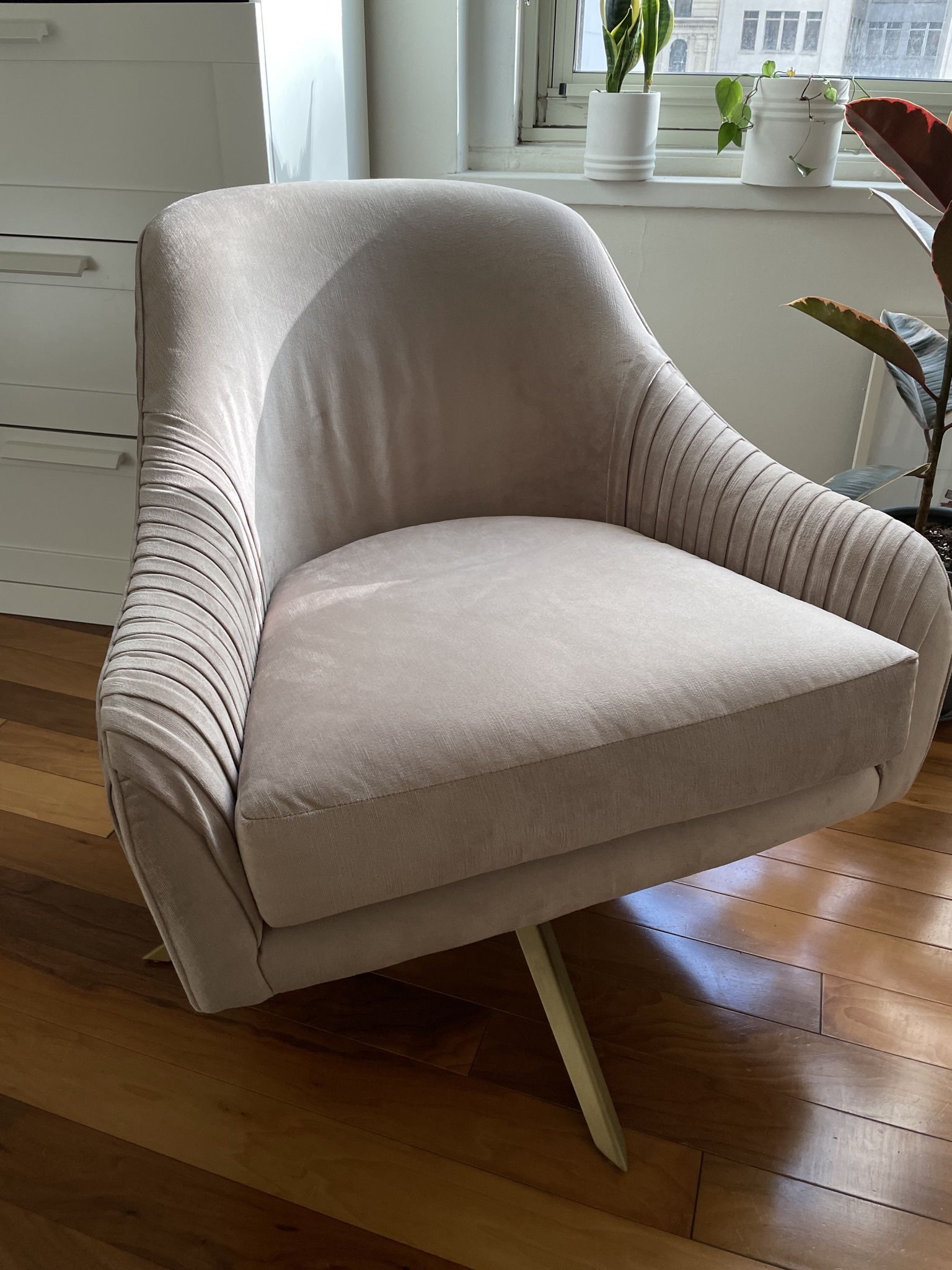 In excellent, clean condition! Luster Velvet, Dusty Blush Details * Created in collaboration with Roar & Rabbit. * Solid and engineered wood frame. * Fiber-wrapped foam cushioning. * Swivel metal base. * Overall:31.5"w. x 32.5"d. x 29.5"h * Seat width:25" * Seat depth:21.75" * Seat height:18.25" * Back height:29.5" * Arm height (front):18" * Arm height (back):23.5" * Diagonal depth:25.5" * Leg height:9.5" * Product weight:40 lbs. https://offerup.com/redirect/?o=aHR0cHM6Ly93d3cud2VzdGVsbS5jb20vcHJvZHVjdHMvcm9hci1yYWJiaXQtYXJtY2hhaXItaDE3MTcv