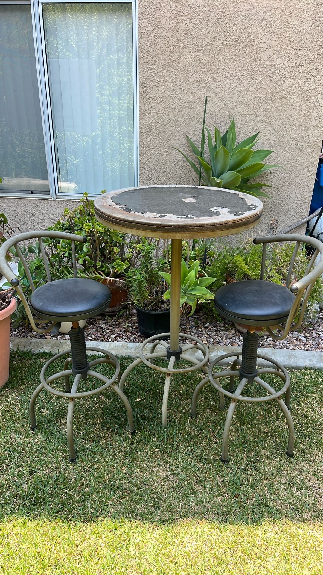 Great paint project or cover the table as shown. 3 piece metal tall bar top table set with with 2 adjustable tall chairs. As is. Pickup only.
