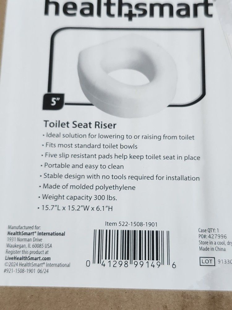 Brand new Opened box Health Smart 5" Toilet Seat Riser, White, Fits Most Seats, Slip Resistant. Made out of polyethylene Measures 15.7 L x 12.5 W x 6.1 H Located in Parkland Pickup only