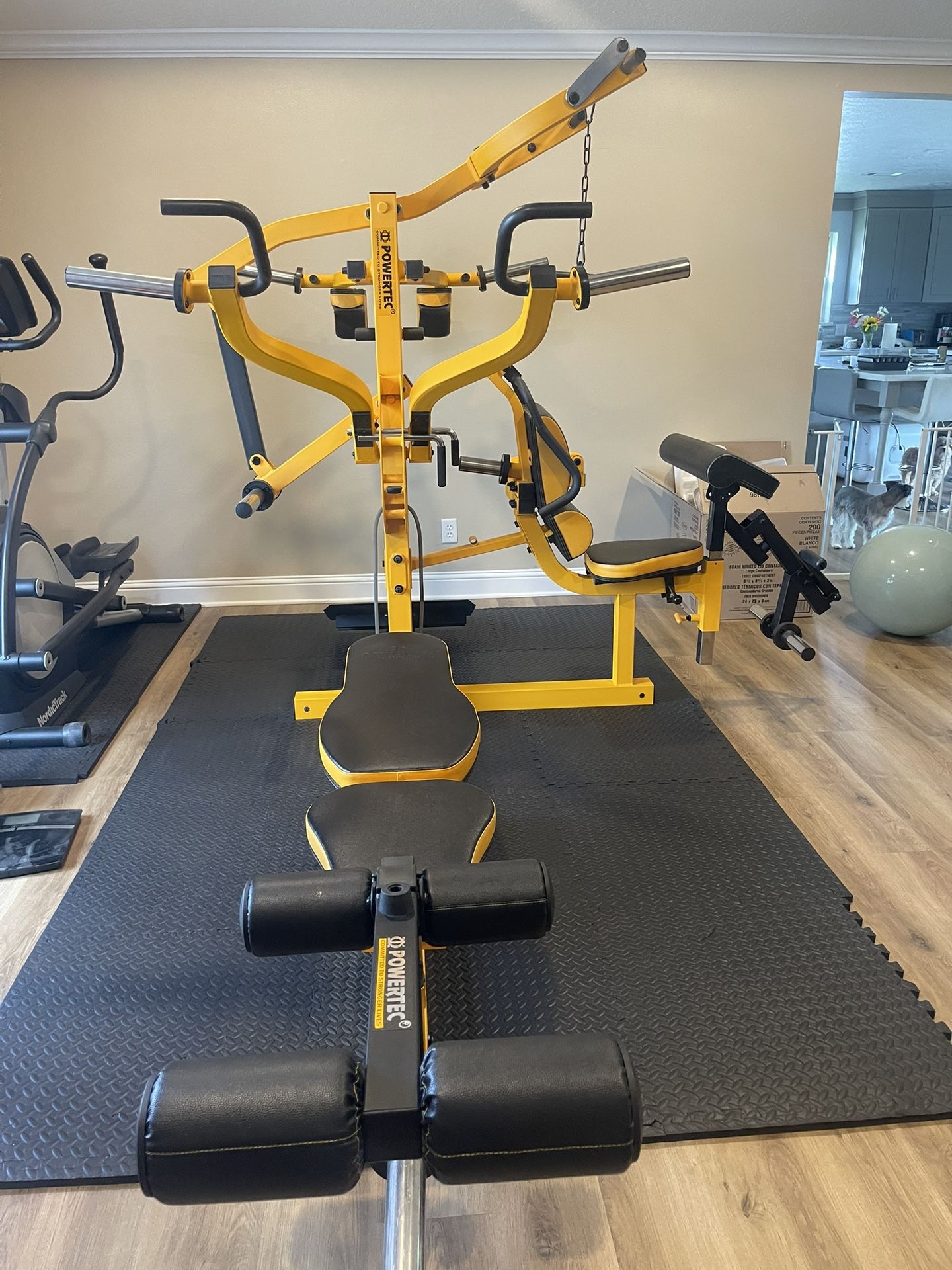 🏋️ Powertec Workbench Multisystem with Full Attachments, Attachment Stand Holder, and 255lb Weight Set with Stands Elevate your home gym experience with the Powertec Workbench Multisystem—a comprehensive, all-in-one strength training solution designed for versatility, durability, and performance. Whether you're a seasoned athlete or just starting your fitness journey, this system offers everything you need to achieve your goals. 🔧 Key Features * **Multi-Station Design**: Train multiple muscle groups simultaneously with three distinct stations: press, lat, and squat. Ideal for up to three users, making it perfect for shared spaces or small group workouts. Isolateral Leverage Arms**: Experience the natural feel of free weights combined with the safety and control of a machine. The arms equate to 20 lbs. lifted, providing a true weight experience. * **Fully Adjustable Bench**: Customize your workouts with 9 horizontal and 9 vertical bench positions, including decline, flat, and 7 incline settings, thanks to the unique ball bearing-driven carriage. * **Expandable Accessory Options**: Enhance your training with modular attachments such as the Pec Fly, Leg Lift, Curl Machine, and Dip Machine. The front tube adaptor accepts Powertec Workbench Attachments. * **Heavy-Duty Construction**: Built to last with improved angled stainless-steel weight horns, extra adjustable press arm settings, and enhanced padding materials. 📦 Included Accessories * **Full Attachment Set**: Comprehensive attachments to target all major muscle groups. * **Attachment Stand Holder**: Keep your accessories organized and easily accessible. * **255lb Weight Set with Stands**: High-quality weights and sturdy stands to support your lifting needs.