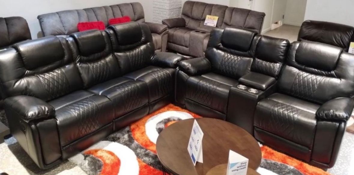 Winter clearance sale. Santiago, black leather reclining sofa and loveseat set only $1199. Easy finance option. Same-day delivery delivery.