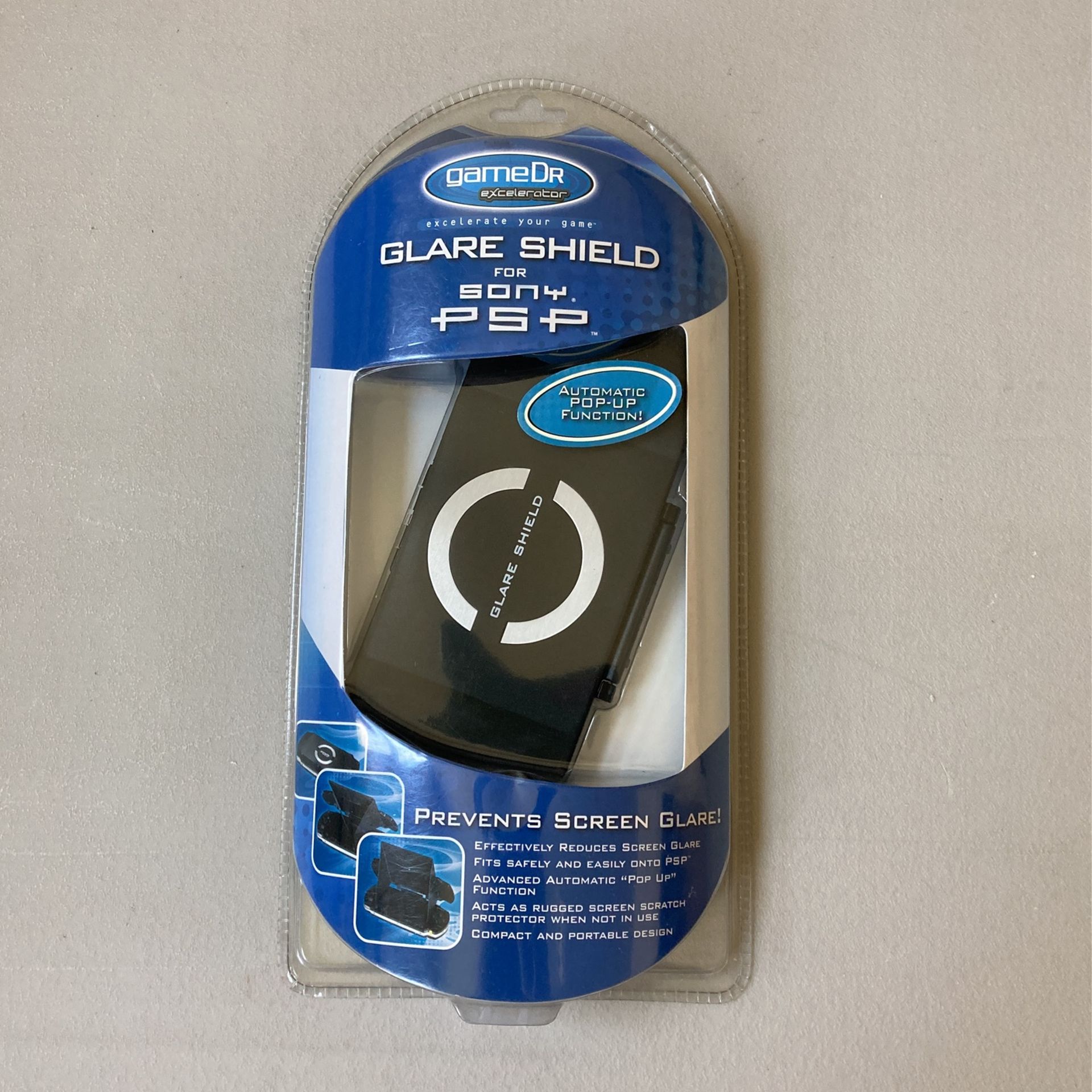 Prevent screen glare! The GameDR Excelerator Series Glare Shield effectively reduces PSP screen glare from sun or brightly lit room, helping you focus on winning the game. When finished, simply collapse the Glare Shield. Available for pick up in LA, CA Wilshire & Vermont
