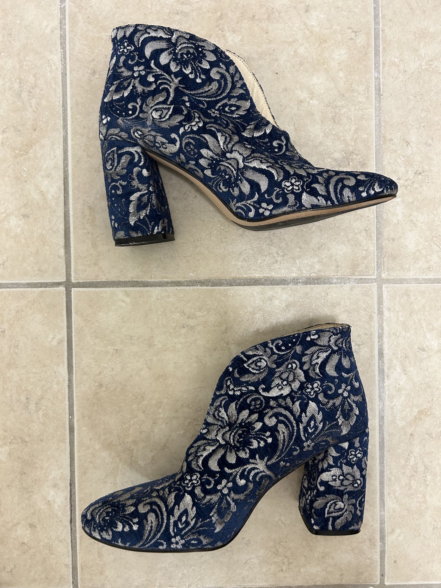 Yes, these are still available. George J. Love cobalt and silver jacquard ankle boots size 41 (fits like a women's 9) with a 3.75" (2" block) heel. Like new condition.
