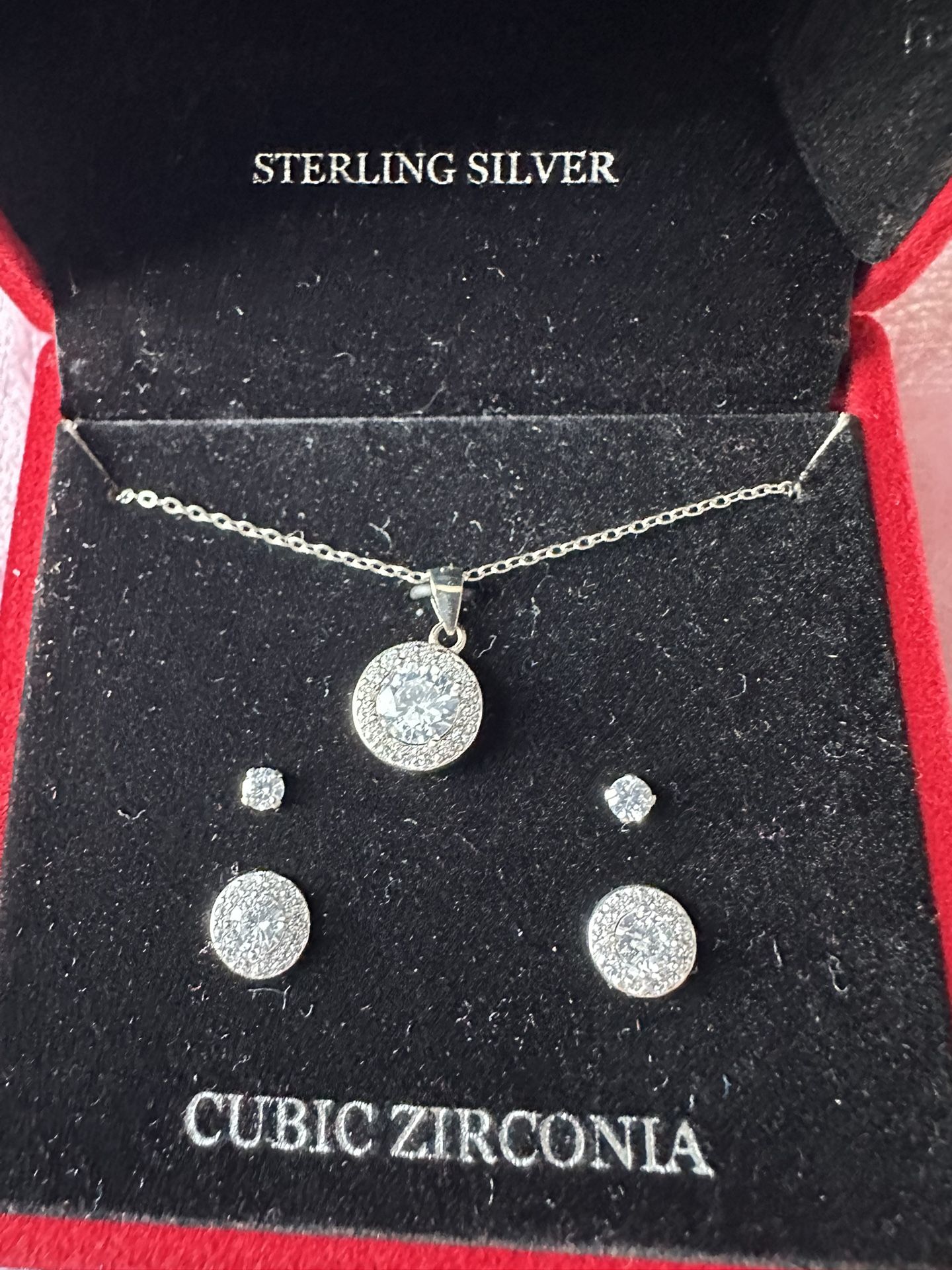 This beautiful Sterling silver set with cubic zirconia is original $100, new never worn, comes in box from a pet and smoke free home