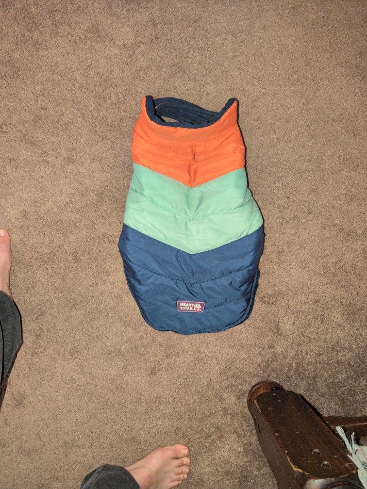 Used condition. Doesn't fit my dog anymore. Great for snowy or rainy conditions. Keeps the pups warm and dry. Size Medium-Large