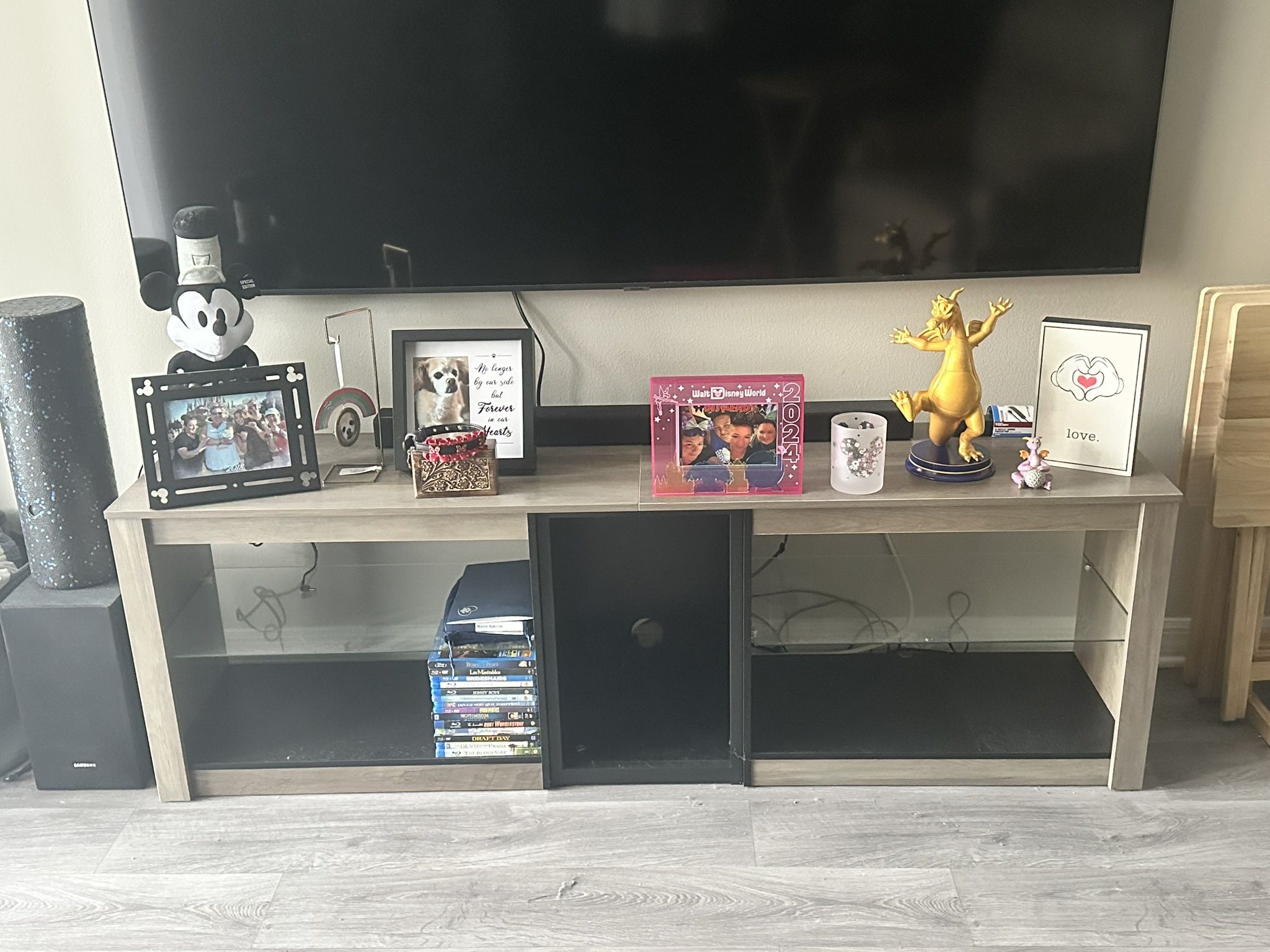Under the tv entertainment shelf. Lights up in different colors. Has remote. Has plenty of shelf space and room for gaming system. Must be able to pick up.