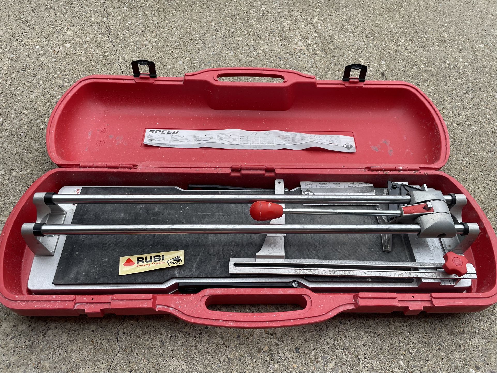 Gently used. -Rubi tile cutter for porcelain, ceramic and glass -Aluminum casting tile cutter, light and tough Professional cutter inexpensive, best in the market -Heavy duty cutting board for professional tilers -Chromed and rectified steel guides, with anti-corrosion treatment -Thick rubber breaking pads -Free anti-shock plastic carrying case -Mobile breaker for greater cutting speed and accuracy.