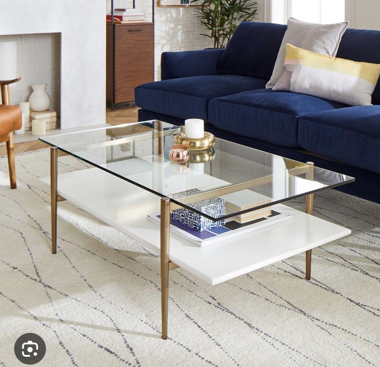 Material: glass top, wooden bottom shelf, bronze metal legs. Dimensions: 46" (length) x 24" (width) 26.25" x 17" (height) Pick up in Edgewater