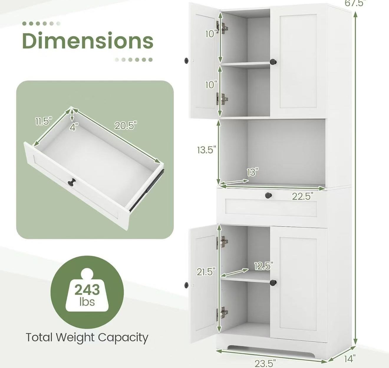 Kitchen Pantry Cabinet, 67.5" Tall Floor Storage Cabinet w/4 Doors & 1 Drawer, Modern Freestanding Bathroom Organizer w/Open Countertop & Adjustable Shelf for Dining Room, Living Room (White) 🙏pay $106.00 + sale tax by cash or card in person (final sale). ✌️Not Accept price negotiation through thIs OfferUp App ; The price is as marked ✌️Pick up at showroom : zip code 80231 or 80223 or 80241 depending on item ✌️Hour : from 10 am to 7 pm(Monday CLOSE) ✌️Pick up only, No delivery , No shipping ✌️please stop by ASAP after all info(including address) provided OR ✌️double confirming “available or not” again if the address info is already provided for days.. 🙏can NOT relocate inquired item to other showrooms but you can wait to see if it is available in other showrooms (current item location zip code can be distinguished by 🥨😀✌️) ✌️ ALL furniture are new and not used at all. However, due to few careless or overweight handling during shipping, transport or assembly, few of them will have mild scratch or dents. So does some inventories in the box. We try our best to photo those in pictures after assembling them. The price is adjusted based on those issue that we notice. ✌️ Item sold as the picture (it is assembled ) or it will be mark as in the boxes 🙏NO RETURN, NO REFUND, NO EXCHANGE