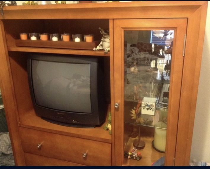 Solid wood.Has glass shelves, built in light that's activated by touching the hinge. Also has built in power outlet. Two drawer nightstand needs to go this weekend so I’m dropping the price. You will need to pick up