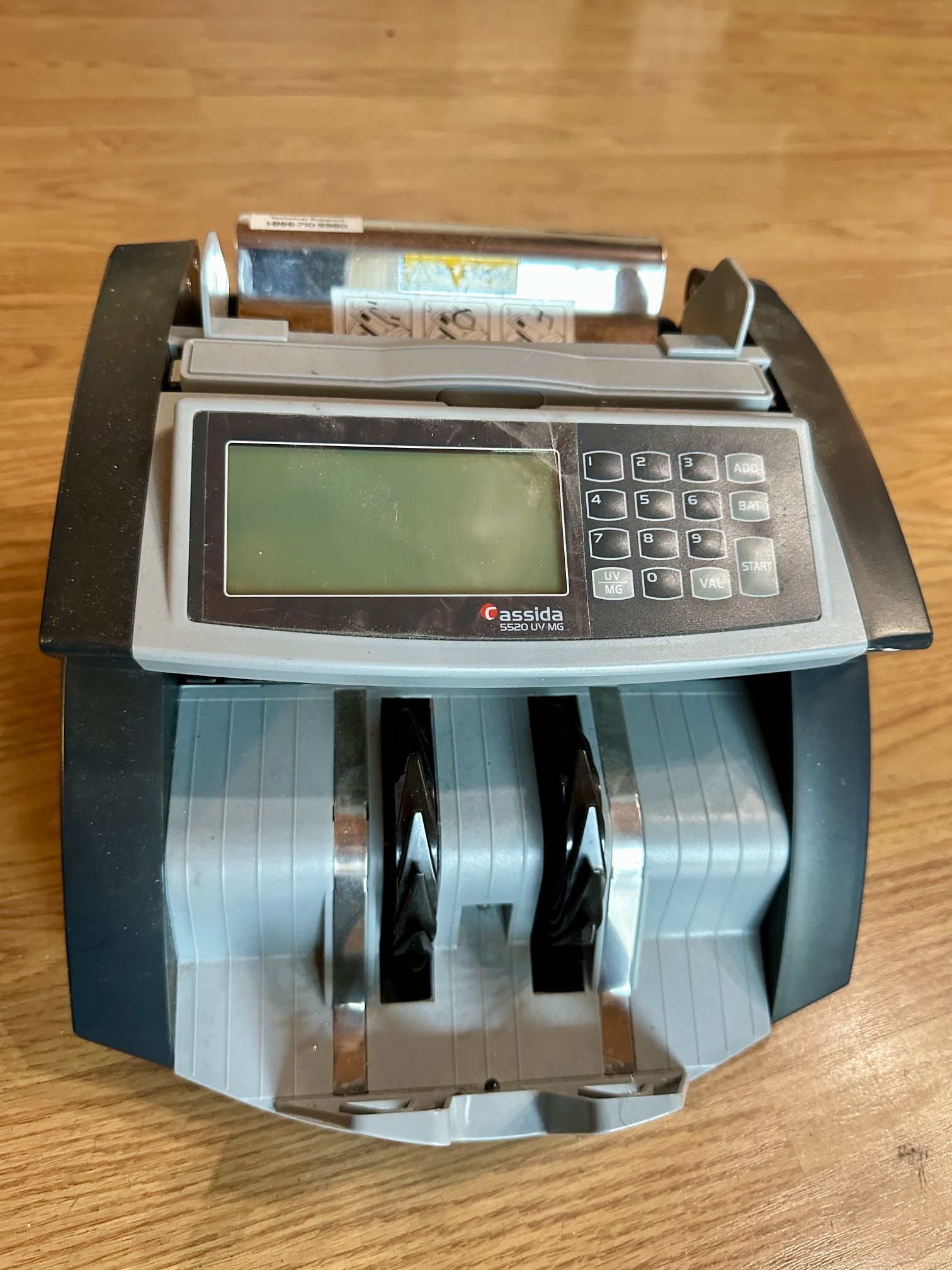Cassida 5520 bill counter with UV/MG counterfeit detection. Counts cash quickly and accurately.