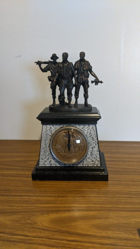 "THE REAL HEROES OF VIETNAM" COMMERATIVE CLOCK From the Franklin mint. 9 1/4" tall. 5 1/2" base width. This is a rare piece of sculpture. Originally Asked $210. But no since I have to clear out storage ... now asking $160 or better offer. Full Disclosure. The clock doesn't move. And I don't know how to get that working. Other than that it's in mint condition. Only taken out of box to take pictures. An Official Heros of Vietnam commemorative shelf clock. This time piece comprises a reproduction metal sculpture marked: ‘F. F. Hart and V. V. M. P. 1984’ depicting three soldiers. The base shows printed names of fallen soldiers. A clock with a gold tone eagle on the face is attached in the center. A sticker to the underside reads:‘Vietnam Veterans Memorial Fund, The Official Heroes of Vietnam Commemorative Clock’.