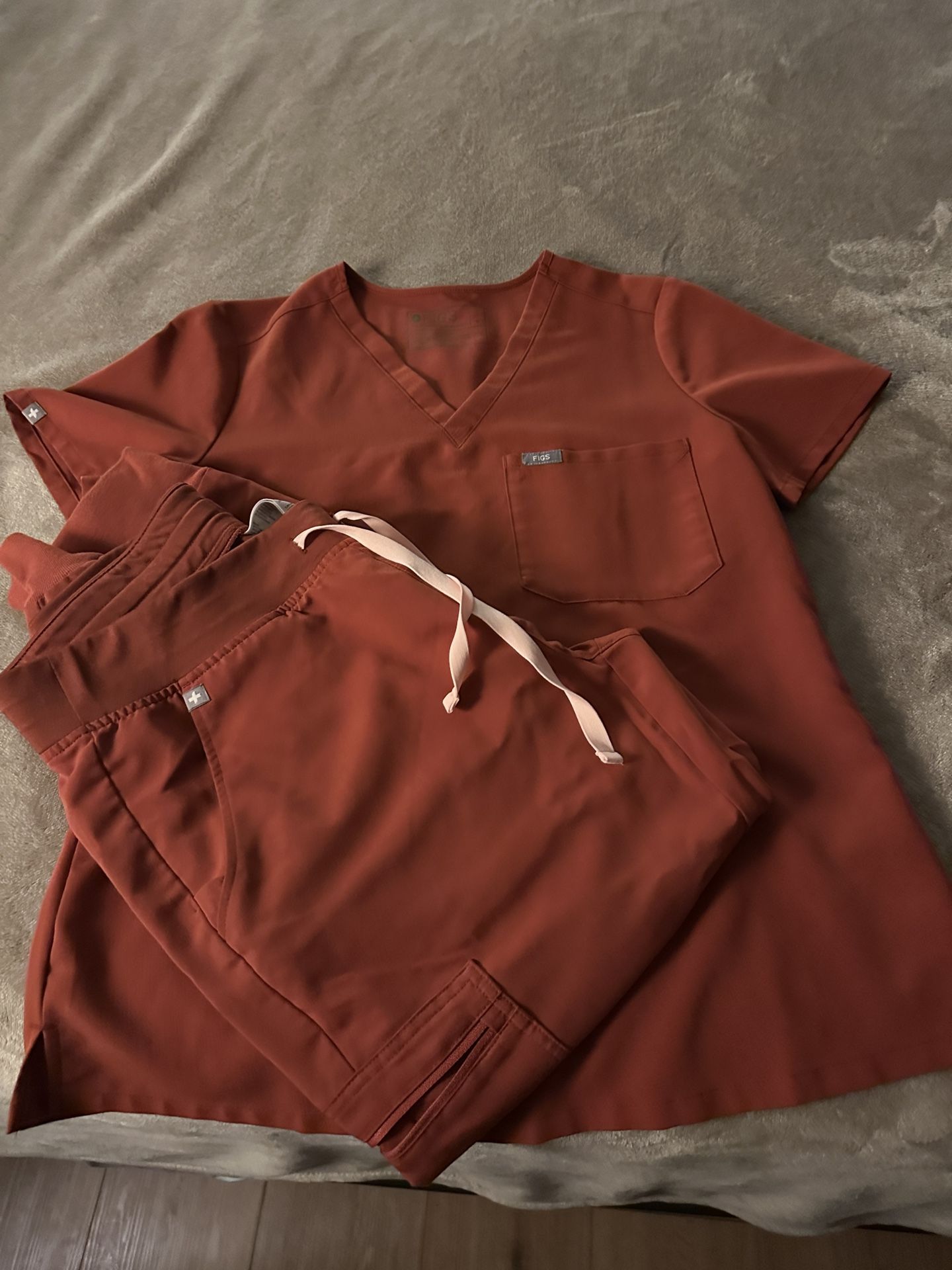 Burnt orange, rarely worn scrubs. Small top, medium bottom-joggers with side zip pocket.