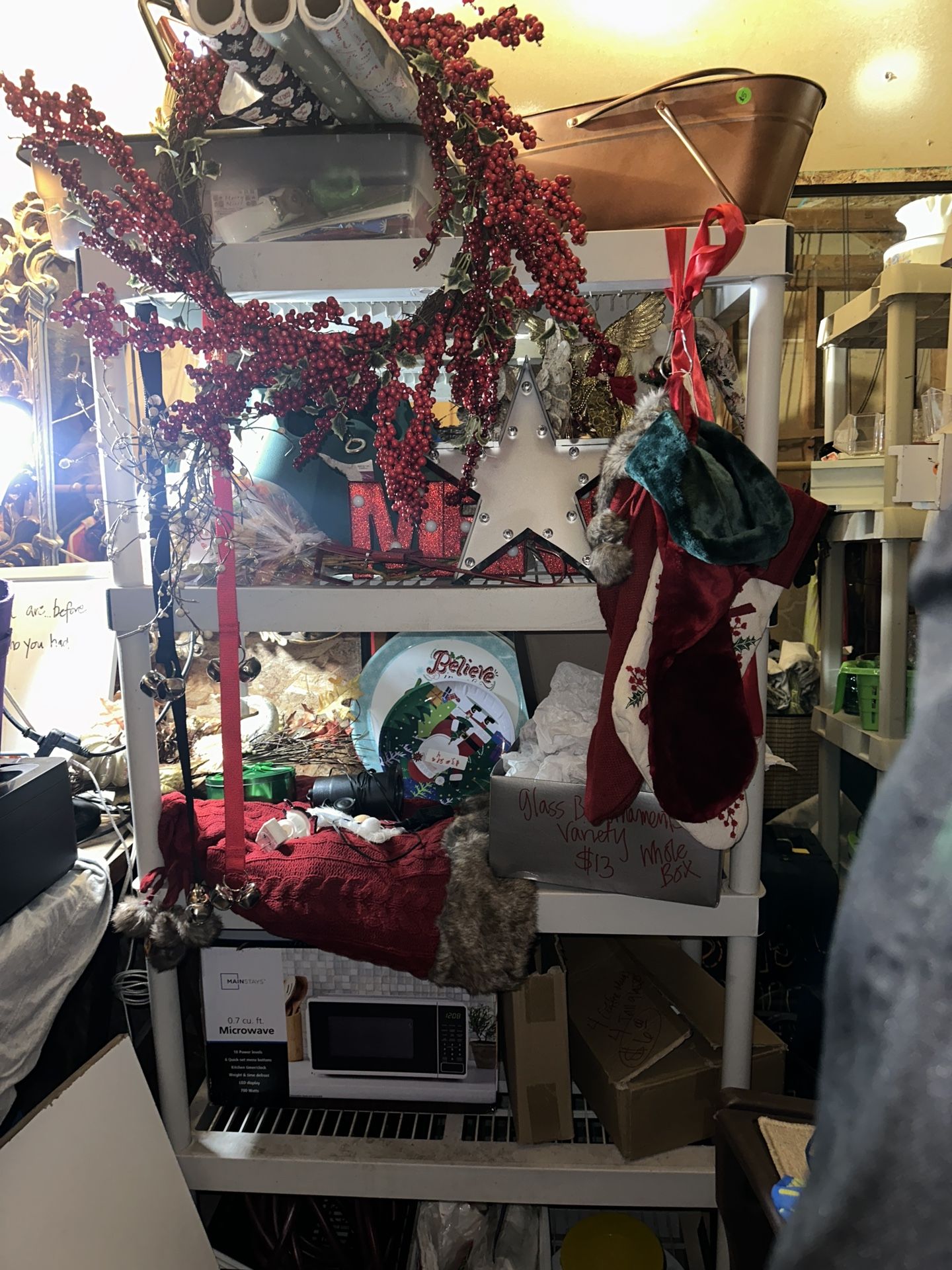 Angel tree toppers, potterybarn tree skirt & stockings, cookie platters, tins, gift bags, ribbon, lots of ornaments, tree stand. And more. Make me an offer.