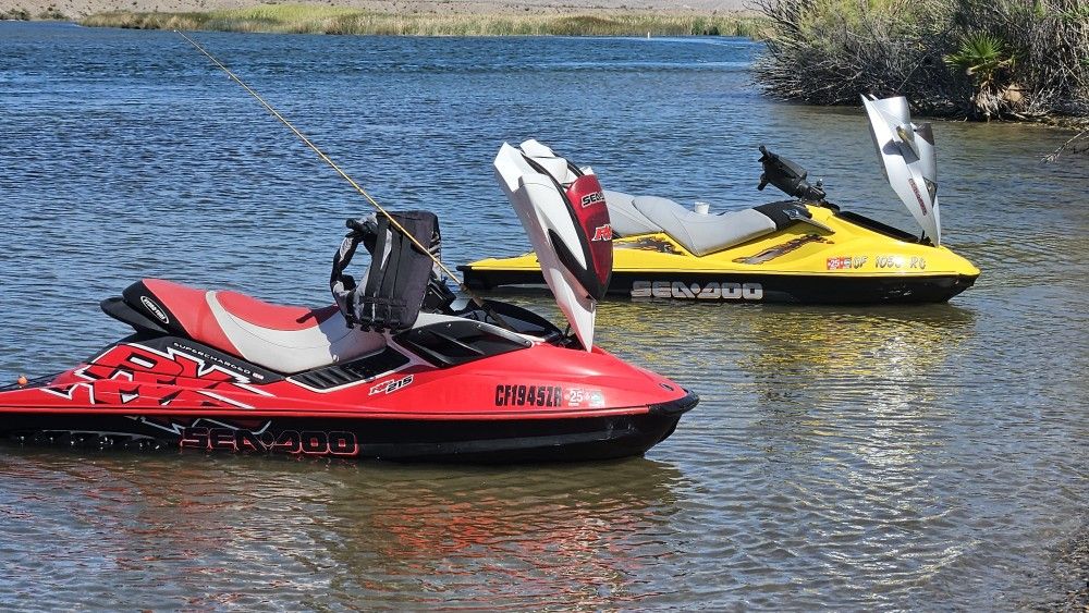 Both seadoo's are RXP215 one is a 3 seater, one is a 2 seater. Don't know why 3 seater is faster. Both run great service every year On a Zimen trailer 05,08 are the years Come take them for a test drive.