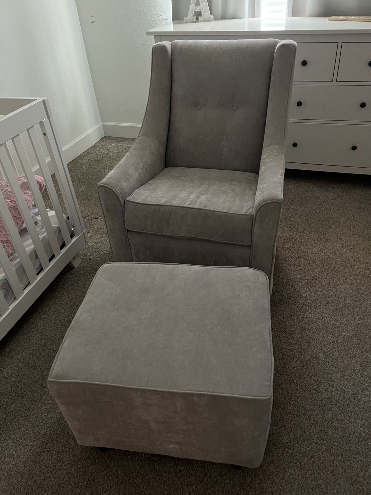 Beautiful gray rocking chair with a comfortable leg rest! This chair was used for room decor.