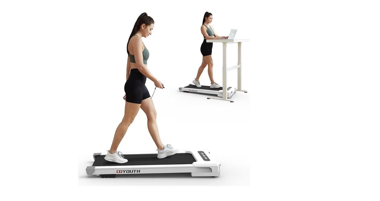 GOYOUTH 2 in 1 Under Desk Electric Treadmill Motorized Exercise Machine with Wireless Speaker, Remote Control and LED Display, Walking Jogging Machine for Home/Office Use Originally $289 【POWERFUL & QUIET MOTOR】With a 2.25 HP powerful quiet Motor, the electric treadmill is perfect for running, jogging, and walking in the comfort of your home. With a durable steel frame and multi-layer shield design, the under desk treadmill's shock-absorbing and noise-reducing, making your running quieter, safer and more comfortable. 【NON-SLIP RUNNING BELT & SHOCK REDUCTION SYSTEM】This walking pad with 15.75" x 41.34" large-area shock-absorbing and non-slip rubber running belt that using this walking machine in an apartment will not disturb other residents. The treadmill is not only suitable for running, but also very under the table for office use. Maximum weight: 300lbs. 【MULTI-FUNCTION DISPLAY & WITH BLUETOOTH SPEAKER】The LED display clearly shows time, calories, step, speed and distance, monitoring your progress in real time and keeping your movement data at a glance. Connect our under desk treadmill to your phone through Bluetooth, so you can play music while you are exercising. 【REMOTE CONTROL & SPEED LEVELS】The ergonomically designed remote control is more comfortable to hold, has a long battery life, and has been drop tested. Security is guaranteed! Available in 0.5 to 6 KMH Speed levels. You can set a constant speed or directly enter the "P" program to accelerate fat burning through preset variable speed running programs. 【P01-P12 PROGRAM & EASY TO MOVE AND STORE】Start the treadmill and enter the "P" program directly to accelerate fat burning through the preset variable speed running program. Can help to improve your cardiovascular fitness, boost your health, and burn fat. The built-in transport wheels make it easy to move and store this under desk treadmill to save space.