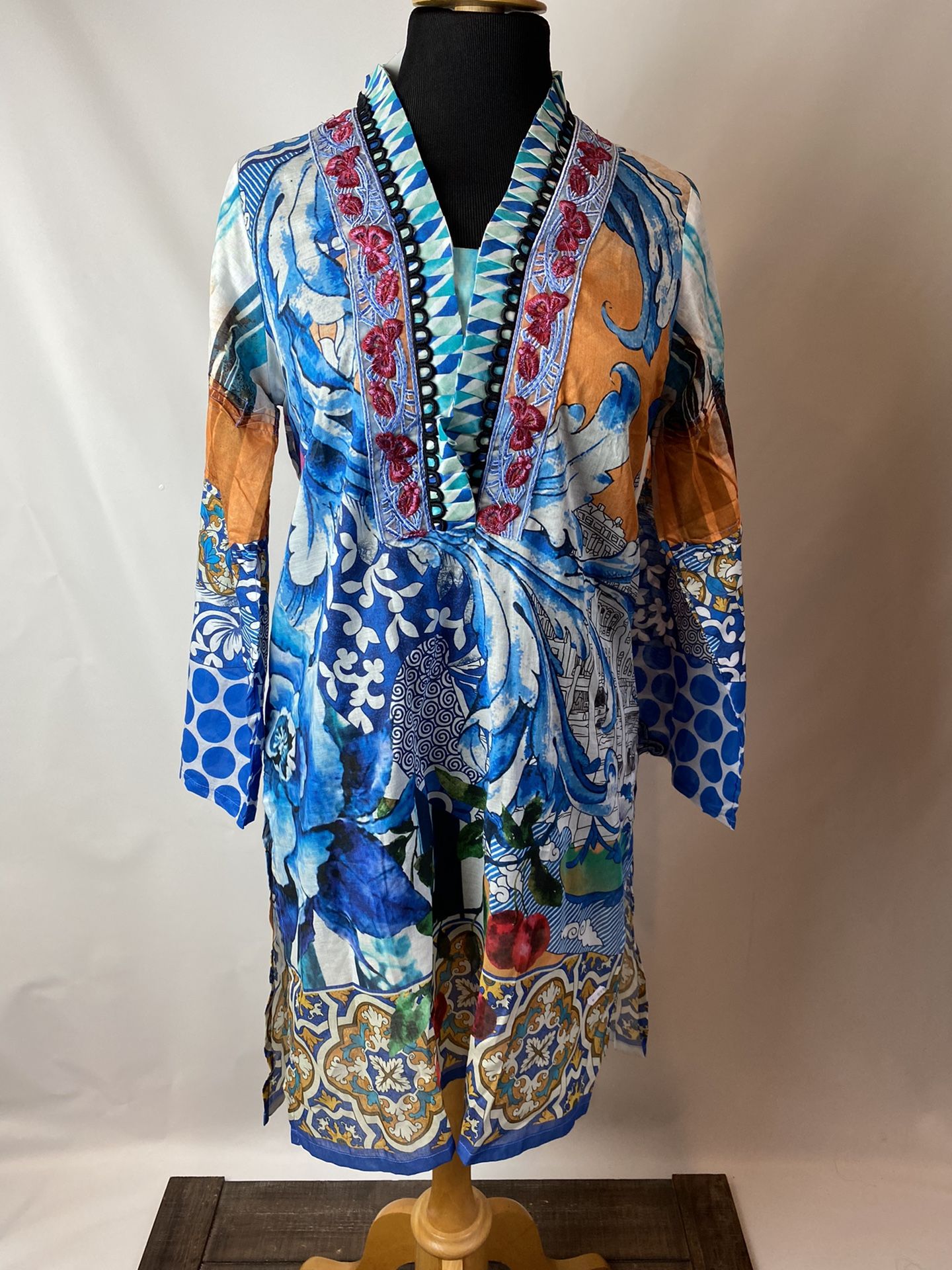 Ideas pret cotton tunic Size medium Shoulder to shoulder 14” Length 36.5” Chest 20” (40”) Sleeve 23 Hips 22 (44)